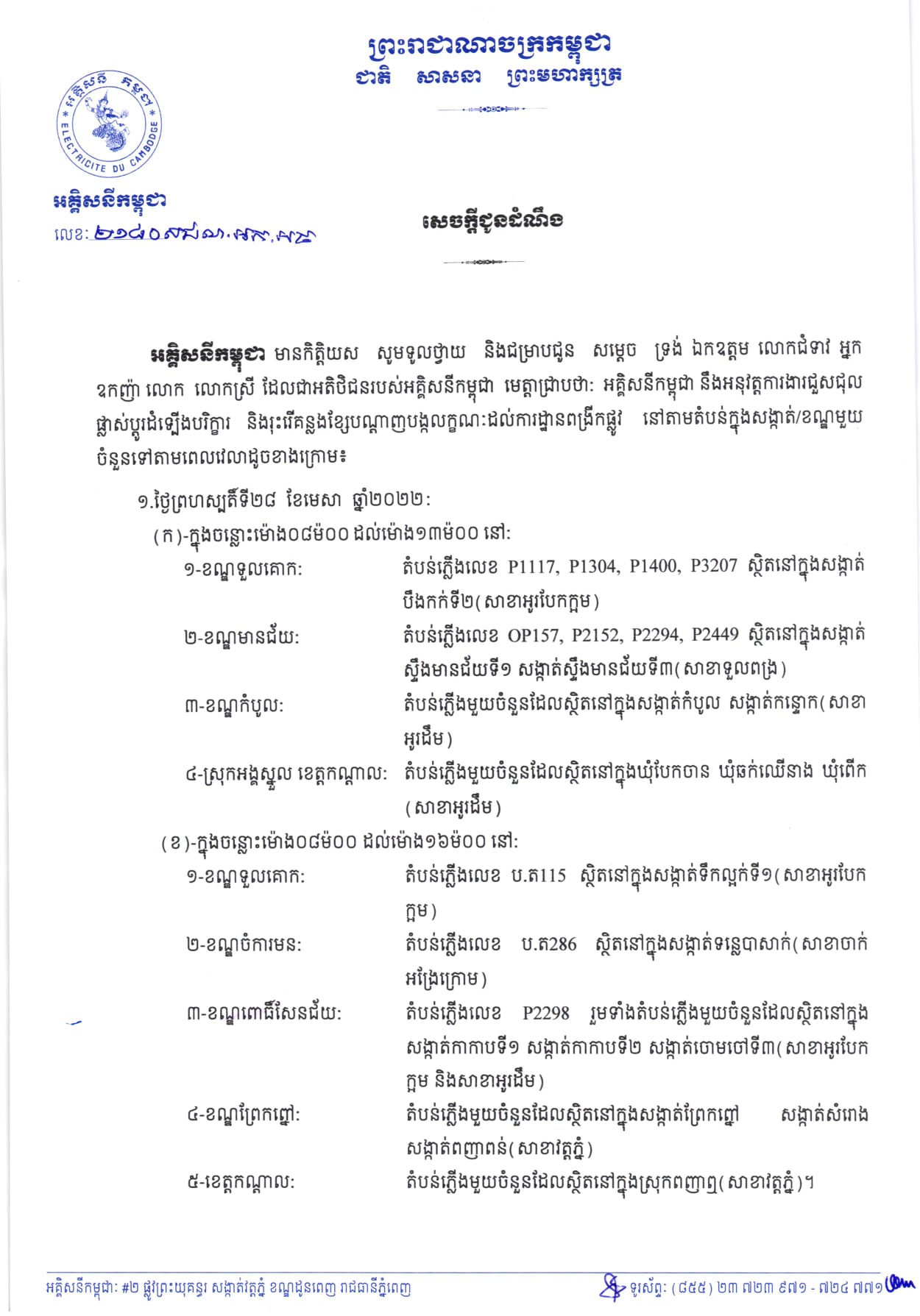 រាជធានីភ្នំពេញ៖ យោងតាមការចុះផ្សាយរបស់ អគ្គិសនីកម្ពុជា នៅថ្ងៃពុធ ១១រោច ខែចេត្រ ឆ្នាំខាល ចត្វាស័ក ព.ស.២៥៦៥ ត្រូវនឹងថ្ងៃទី២៧ ខែមេសា ឆ្នាំ២០២២ បានចេញសេចក្តីជូនដំណឹងស្តីពីការអនុវត្តការងារជួសជុល ផ្លាស់ប្តូរតម្លើងបរិក្ខារនានា និងរុះរើគន្លងខ្សែបណ្តាញអគ្គិសនីរបស់អគ្គិសនីកម្ពុជា ដើម្បីបង្កលក្ខណៈងាយស្រួលដល់ការដ្ឋានពង្រីកផ្លូវ នៅថ្ងៃទី២៨ ខែមេសា ឆ្នាំ២០២២ ដល់ថ្ងៃទី០១ ខែឧសភា ឆ្នាំ២០២២ នៅតំបន់មួយចំនួនទៅតាមពេលវេលា និងទីកន្លែងដូចសេចក្តីជូនដំណឹងលម្អិតខាងក្រោម។