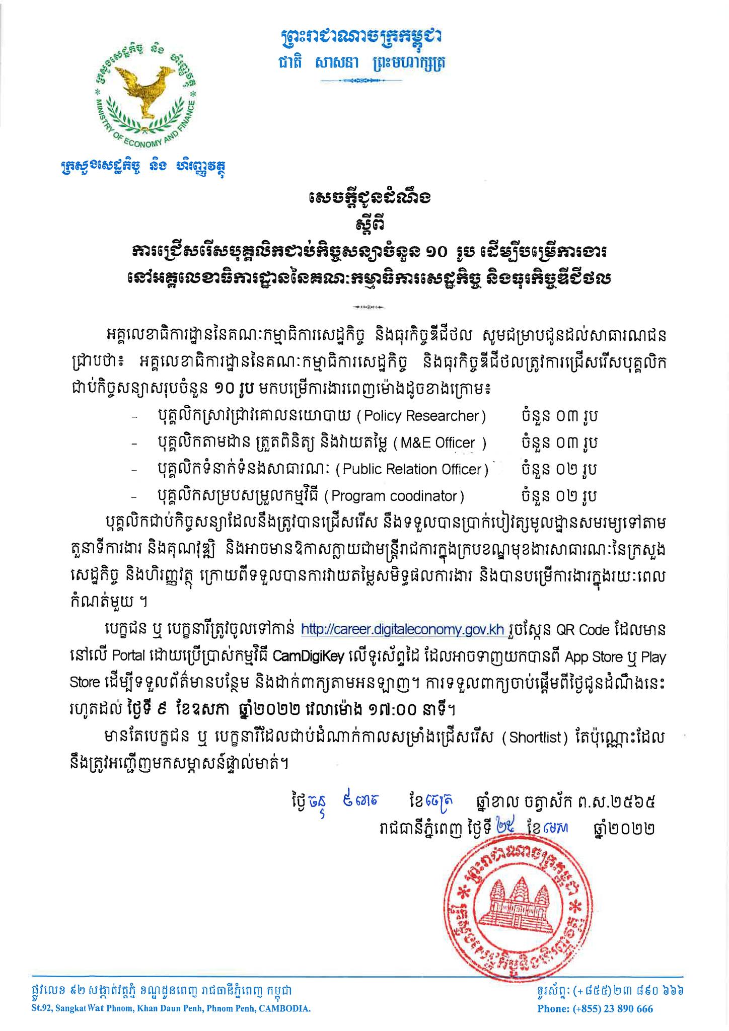 រាជធានីភ្នំពេញ៖ យោងតាមការចុះផ្សាយរបស់ ក្រសួងសេដ្ឋកិច្ច និងហិរញ្ញវត្ថុ នៅថ្ងៃទី២៩ ខែមេសា ឆ្នាំ២០២២ បានចេញសេចក្តីជូនដំណឹងស្តីពីការជ្រើសរើសបុគ្គលិកជាប់កិច្ចសន្យាចំនួន ១០រូប ដើម្បីបម្រើការងារនៅអគ្គលេខាធិការដ្ឋាននៃគណៈកម្មាធិការសេដ្ឋកិច្ច និងធុរកិច្ចឌីជីថល។