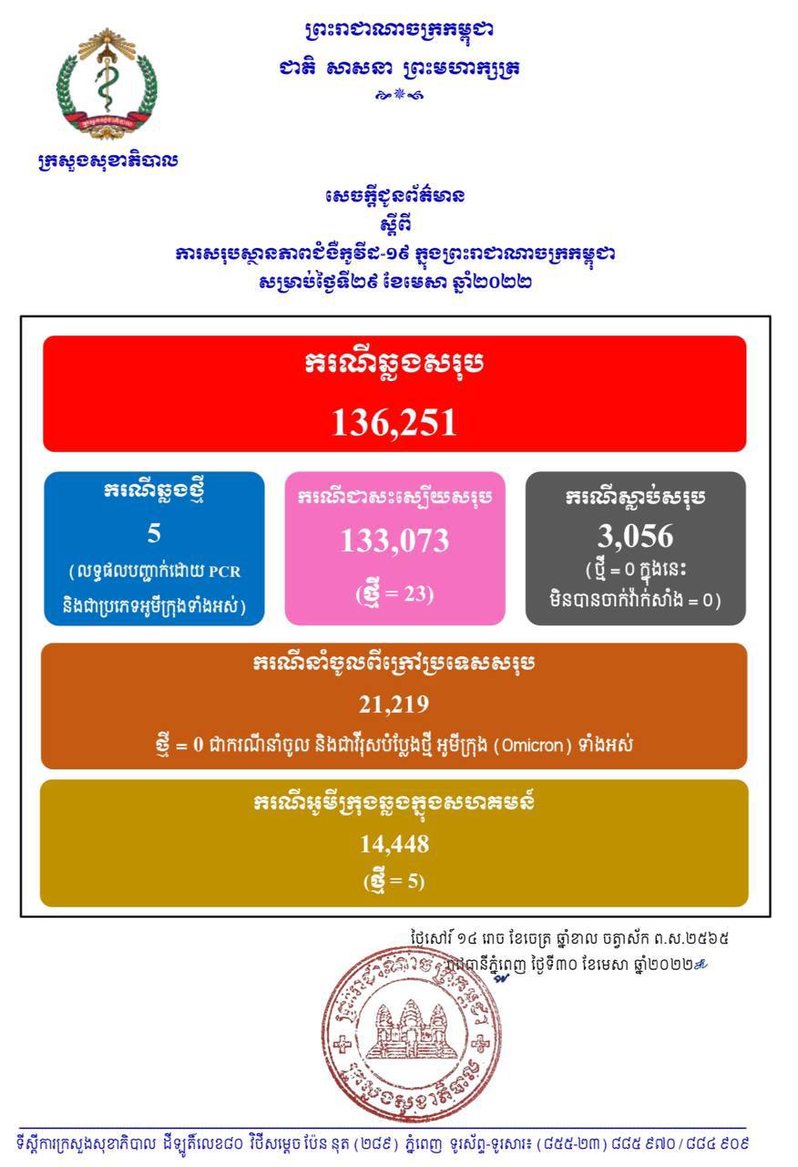 នៅថ្ងៃទី30 ខែមេសា ឆ្នាំ2022នេះ ក្រសួងសុខាភិបាលកម្ពុជា បានចេញសេចក្តីជូនដំណឹងពី ការរកឃើញករណីវិជ្ជមានវីរុសកូវីដ១៩ថ្មី ចំនួន 05នាក់ (លទ្ធផលបញ្ជាក់ដោយ PCR នឹងជាប្រភេទអូមីក្រុងទាំងអស់) ក្នុងនោះករណីឆ្លងសហគមន៍ទាំងអស់ និងមិនមានករណីនាំចូលទេ ខណៈអ្នកបានជាសះស្បើយថ្មីមានចំនួន 23នាក់ និងមិនមានអ្នកបាត់បង់ជីវិតទេ ហើយគិតមកទល់ពេលនេះ ករណីឆ្លងកូវីដ១៩ សរុបនៅក្នុងប្រទេសកម្ពុជា មានចំនួន 136,251 នាក់, ករណីជាសះស្បើយសរុប 133,073 នាក់ និងស្លាប់សរុប 3,056 នាក់៕