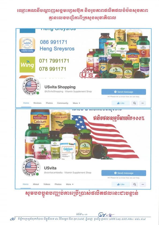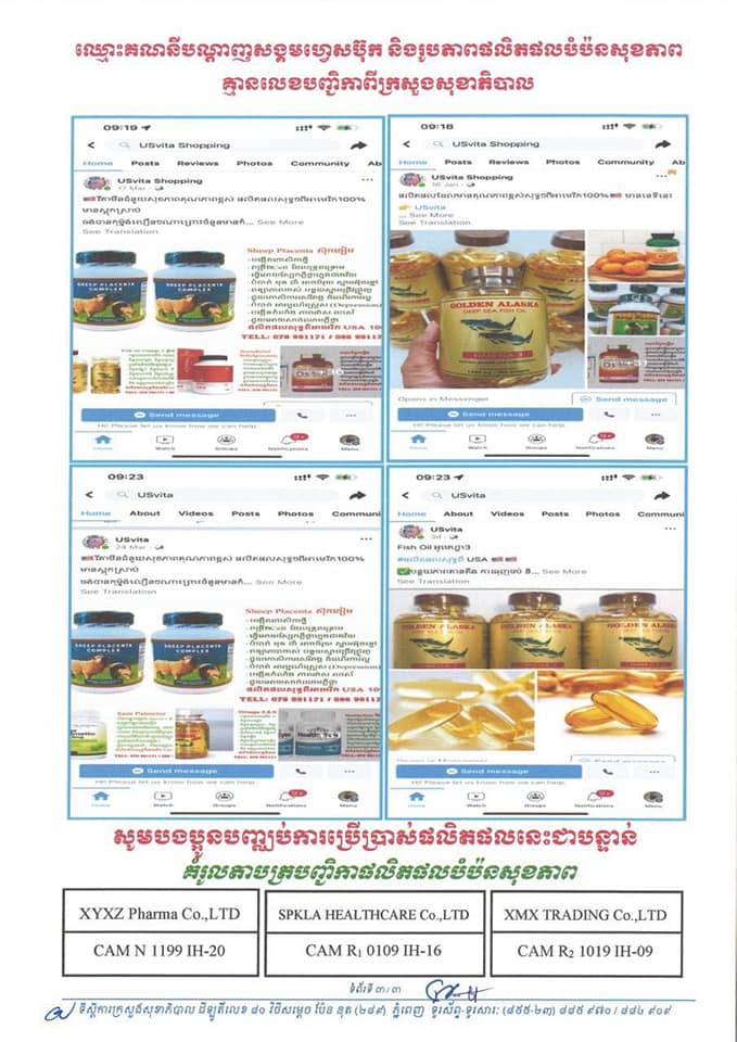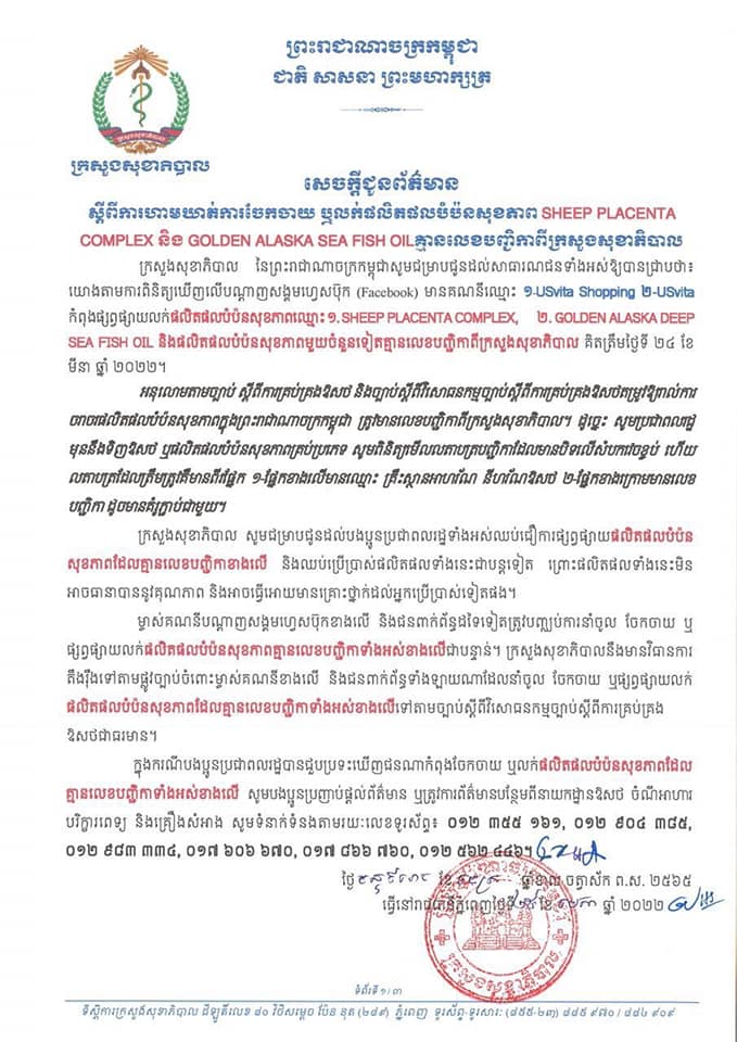 ក្រសួងសុខាភិបាល សូមជម្រាបសាធារណជនទាំងអស់ជ្រាបថា យោងតាមការពិនិត្យឃើញលើបណ្ដាញសង្គមហ្វេសប៊ុក មានគណនីឈ្មោះ ១.Usvita Shopping ២.Usvita កំពុងផ្សព្វផ្សាយលក់ ផលិតផលបំប៉នសុខភាពឈ្មោះ ១.SHEEP PLACENTA COMPLEX ២.GOLDEN ALASKA DEEP SEA FISH OIL និងផលិតផលបំប៉នសុខភាពមួយចំនួនទៀតគ្មានលេខបញ្ជិកាពីក្រសួងសុខាភិបាល គិតត្រឹមថ្ងៃទី២៤ ខែមីនា ឆ្នាំ២០២២។