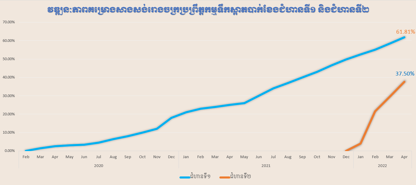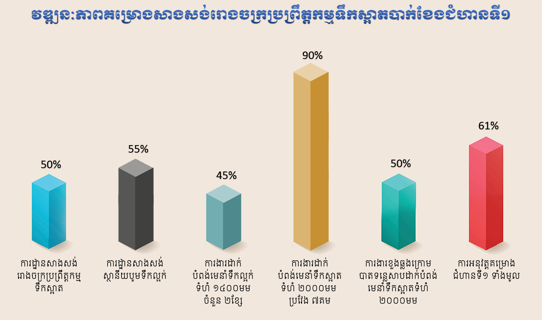 -ផ្នែកទី១ ការដ្ឋានសាងសាង់រោងចក្រប្រព្រឹត្តកម្មទឹកស្អាត (អាងទទួល, អាងកូរយឺត-លឿន, អាងរងកករ, អាងច្រោះ, អាងស្តុកទឹក, អគារដាក់វត្ថុធាតុដើម, អគារក្ល័រ, មន្ទីរពិសោធ៍ទឹក, ស្ថានីយបូមទឹកស្អាត និងអគាររដ្ឋបាល) សម្រេចបាន ៥០% ។