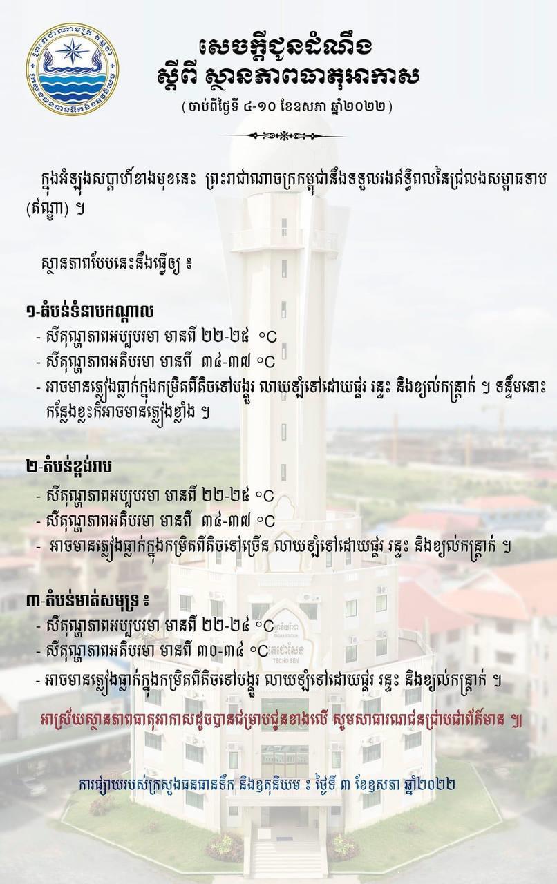 រាជធានីភ្នំពេញ៖ យោងតាមការចុះផ្សាយរបស់ ក្រសួងធនធានទឹក និងឧតុនិយម នៅថ្ងៃទី០៣ ខែឧសភា ឆ្នាំ២០២២ បានចេញសេចក្ដីជូនដំណឹងស្ដីពី ស្ថានភាពធាតុអាកាស ចាប់ពីថ្ងៃទី០៤ ដល់ថ្ងៃទី១០ ខែឧសភា ឆ្នាំ២០២២ បានក្នុងអំឡុងសប្តាហ៍ខាងមុខនេះ ព្រះរាជាណាចក្រកម្ពុជា នឹងទទួលរងឥទ្ធិពលនៃជ្រលងសម្ពាធទាប (ឥណ្ឌា) ។