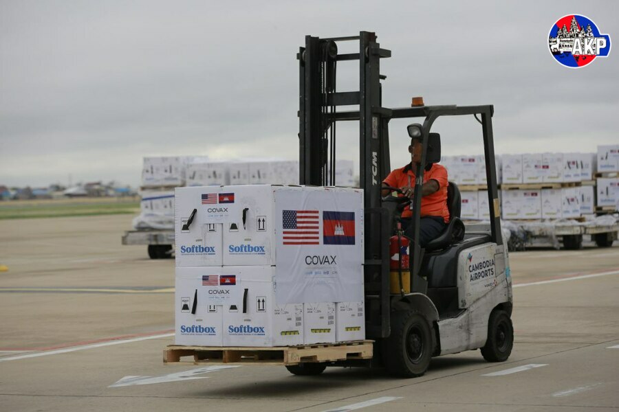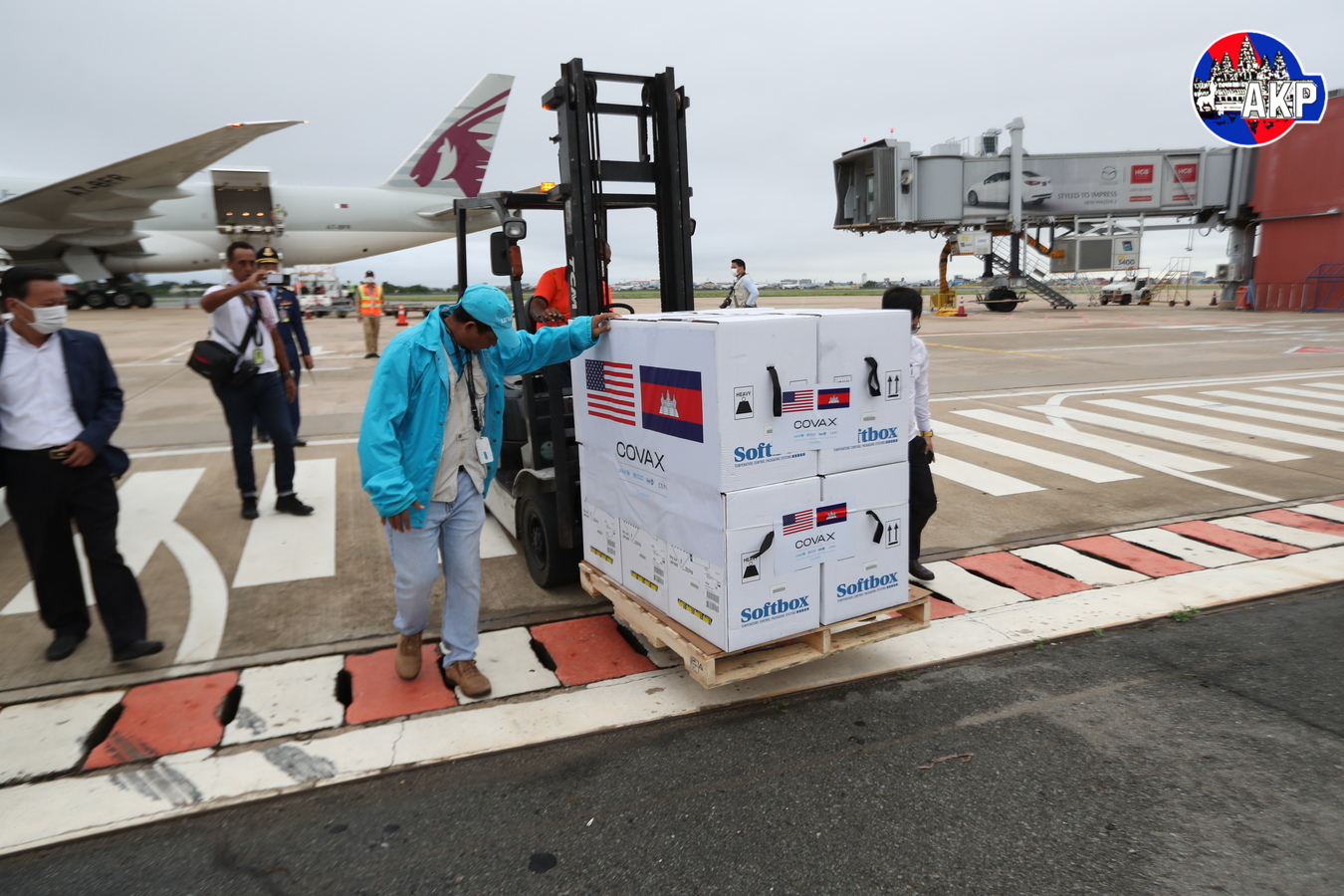 វ៉ាក់សាំងកូវីដ-១៩ ប្រភេទ Pfizer ចំនួន ២ លានដូស ដែលជាជំនួយរបស់សហរដ្ឋអាមេរិក មកដល់អាកាសយានដ្ឋានអន្តរជាតិភ្នំពេញ
