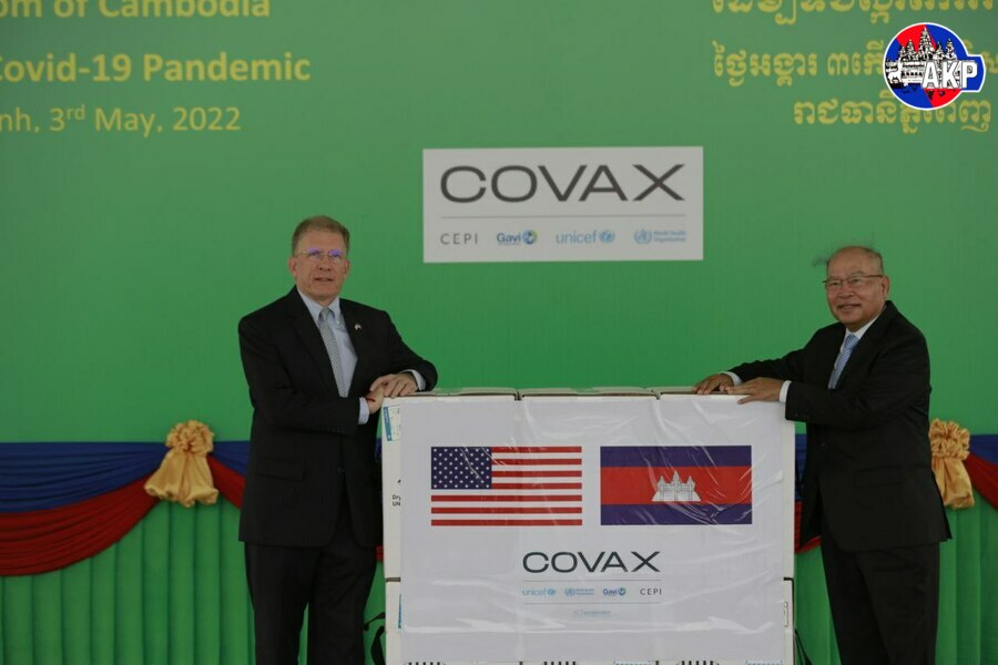 រាជធានិភ្នំពេញ៖ យោងតាមការចុះផ្សាយរបស់ ក្រសួងព័ត៌មាន នៅថ្ងៃទី០៣ ខែឧសភា ឆ្នាំ២០២២ បានឲ្យដឹងថា ឯកឧត្តម សាស្រ្តាចារ្យ ម៉ម ប៊ុនហេង រដ្ឋមន្រ្តីក្រសួងសុខាភិបាល និងឯកឧត្ដម W. Patrick Murphy ឯកអគ្គរដ្ឋទូតសហរដ្ឋអាមេរិក ប្រចាំនៅកម្ពុជា ព្រមទាំងតំណាងអង្គការ UNICEF និងអង្គការសុខភាពពិភពលោក អញ្ជើញទទួលការមកដល់នូវវ៉ាក់សាំងបង្ការជំងឺកូវីដ-១៩ ដែលជាជំនួយរបស់ប្រទេសសហរដ្ឋអាមេរិកផ្តល់ជូនប្រទេសកម្ពុជា តាមរយៈយន្តការ COVAX ចំនួន ២ លានដូស នៅអាកាសយានដ្ឋានអន្តរជាតិភ្នំពេញ នាព្រឹកថ្ងៃទី០៣ ខែឧសភា ឆ្នាំ២០២២៕