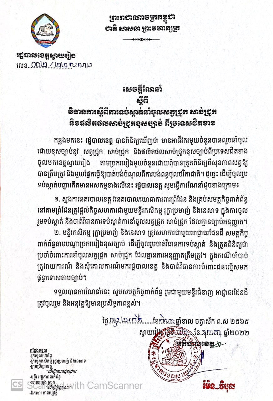 ខេត្តស្វាយរៀង៖ យោងតាមការចុះផ្សាយរបស់ រដ្ឋបាលខេត្តស្វាយរៀង នៅថ្ងៃទី០៣ ខែឧសភា ឆ្នាំ២០២២ បានចេញសេចក្តីណែនាំរបស់រដ្ឋបាលខេត្តស្វាយរៀងស្តីពីវិធានការទប់ស្កាត់ការនាំចូលសត្វជ្រូក និងផលិតផលសាច់ជ្រូកខុសច្បាប់ពីប្រទេសជិតខាង។