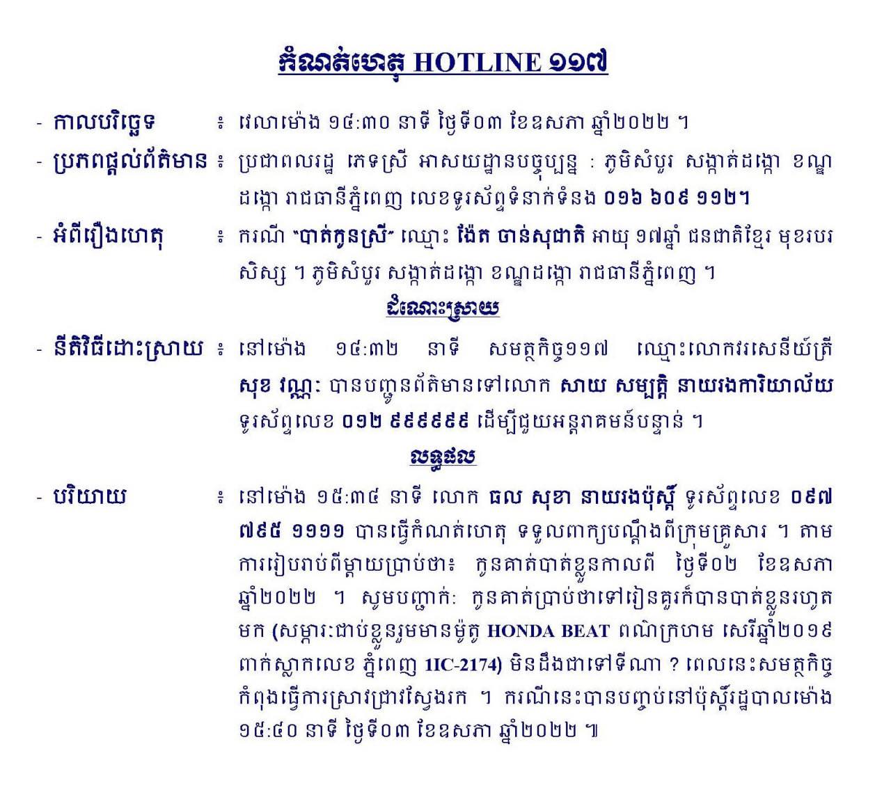 ប្រភពផ្ដល់ព័ត៌មាន នៅវេលាម៉ោង ១៤៖៣០ នាទីរសៀល ថ្ងៃទី០៣ ខែឧសភា ឆ្នាំ២០២២ ក្រុមការងារមជ្ឈមណ្ឌលប្រចាំបញ្ជា នៃអគ្គស្នងការដ្ឋាននគរបាលជាតិ បានទទួលព័ត៌មានពីករណីខាងលើ ដែលស្ថិតនៅភូមិសំបួរ សង្កាត់ដង្កោ ខណ្ឌដង្កោ រាជធានីភ្នំពេញ។ តាមការរៀបរាប់ពីម្ដាយប្រាប់ថា៖ កូនគាត់បាត់ខ្លួនកាលពីថ្ងៃទី០២ ខែឧសភា ឆ្នាំ២០២២។ សូមបញ្ជាក់៖ កូនគាត់ប្រាប់ថាទៅរៀនគួរក៏បានបាត់ខ្លួនរហូតមក(សម្ភារៈជាប់ខ្លួនរួមមានម៉ូតូ HONDA BEAT ពណ៌ក្រហម ស៊េរីឆ្នាំ២០១៩ ពាក់ស្លាកលេខ ភ្នំពេញ 1IC-2174 ) មិនដឹងជាទៅទីណា? ពេលនេះសមត្ថកិច្ចកំពុងធ្វើការស្រាវជ្រាវស្វែងរក។ ករណីនេះបានបញ្ចប់នៅប៉ុស្ដិ៍រដ្ឋបាលម៉ោង១៥៖៤០នាទី ថ្ងៃទី០៣ ខែឧសភា ឆ្នាំ២០២២៕