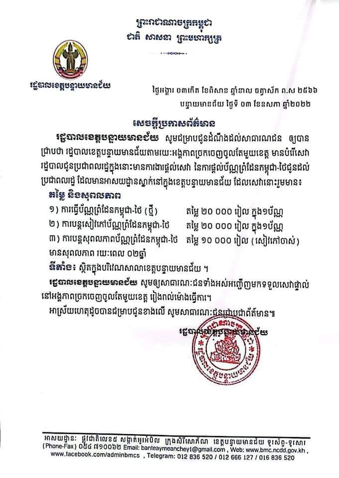 ក្រុងប៉ោយប៉ែត៖ យោងតាមការចុះផ្សាយរបស់ រដ្ឋបាលខេត្តបន្ទាយមានជ័យ នៅថ្ងៃទី០៤ ខែឧសភា ឆ្នាំ២០២២ បានចេញសេចក្ដីប្រកាសព័ត៌មាន ឲ្យបានជ្រាបថា រដ្ឋបាលខេត្ត តាមរយៈអង្គភាពច្រកចេញចូលតែមួយខេត្ត មានបំរើសេវារដ្ឋបាលជូនប្រជាពលរដ្ឋក្នុងនោះមានការងារផ្ដល់សេវា នៃការផ្ដល់ប័ណ្ណព្រំដែនកម្ពុជា-ថៃ ជូនដល់ប្រជាពលរដ្ឋ ដែលមានអាសយដ្ឋានស្នាក់នៅក្នុងខេត្តបន្ទាយមានជ័យ ដែលសេវានោះរួមមាន៖