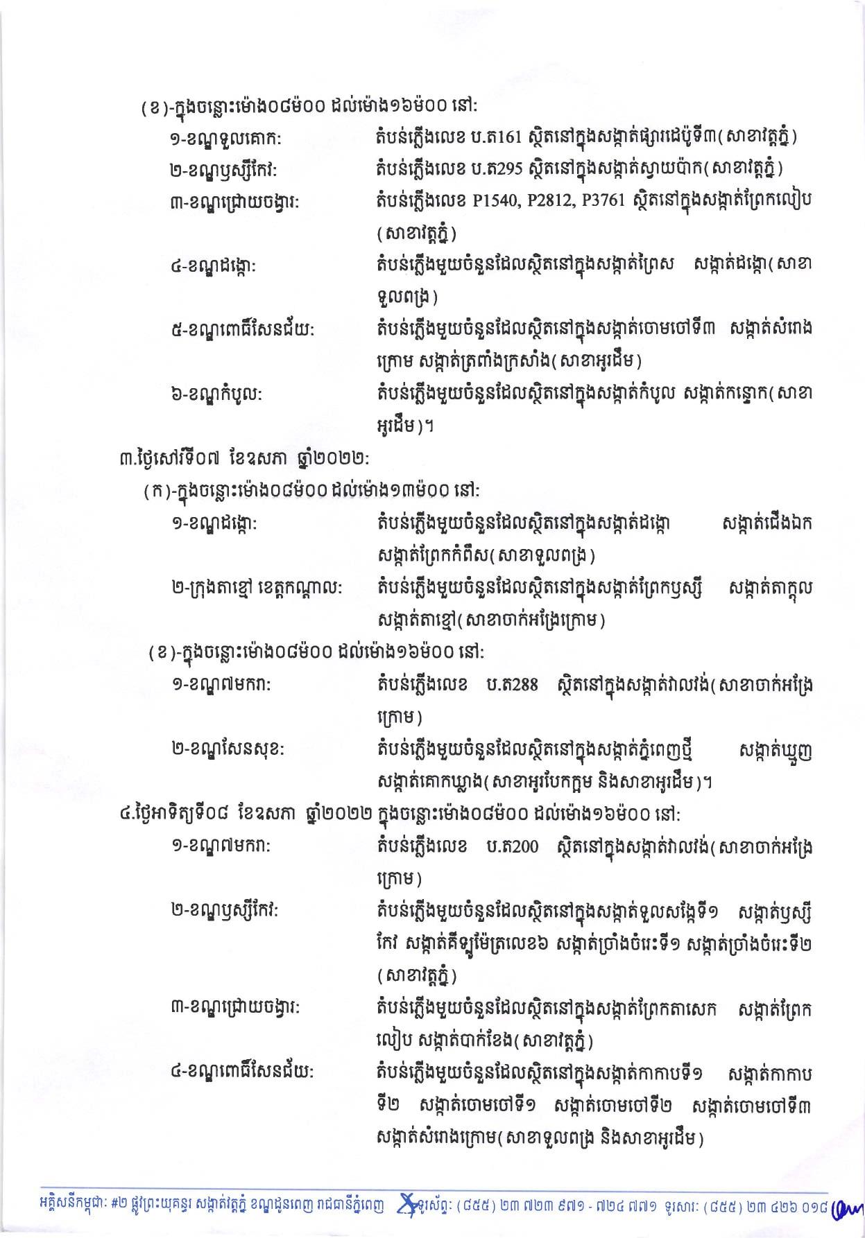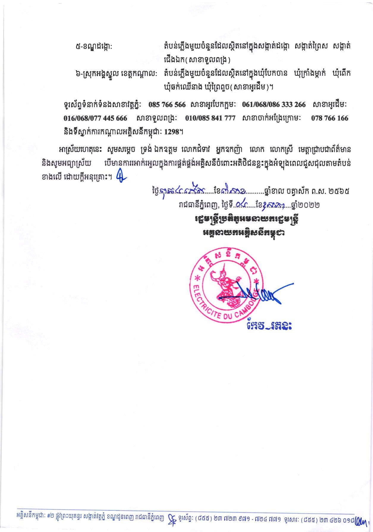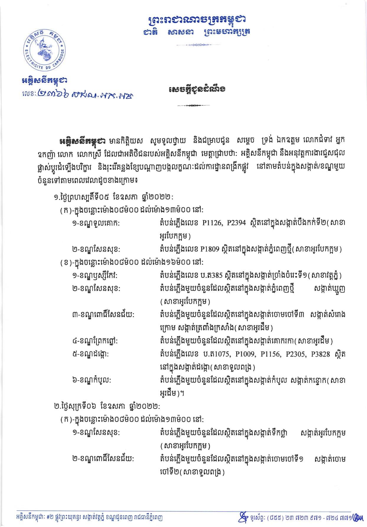 រាជធានីភ្នំពេញ៖ យោងតាមការចុះផ្សាយរបស់ អគ្គិសនីកម្ពុជា នៅថ្ងៃពុធ ៤កើត ខែពិសាខ ឆ្នាំខាល ចត្វាស័ក ព.ស.២៥៦៥ ត្រូវនឹងថ្ងៃទី០៤ ខែឧសភា ឆ្នាំ២០២២ បានចេញសេចក្តីជូនដំណឹង ស្តីពីការអនុវត្តការងារជួសជុល ផ្លាស់ប្តូរ តម្លើងបរិក្ខារនានា និងរុះរើគន្លង ខ្សែបណ្តាញអគ្គិសនីរបស់អគ្គិសនីកម្ពុជា ដើម្បីបង្កលក្ខណៈងាយស្រួល ដល់ការដ្ឋានពង្រីកផ្លូវ នៅថ្ងៃទី០៥ ខែឧសភា ឆ្នាំ២០២២ ដល់ថ្ងៃទី០៨ ខែឧសភា ឆ្នាំ២០២២ នៅតំបន់មួយចំនួនទៅតាមពេលវេលា និងទីកន្លែងដូចសេចក្តី ជូនដំណឹងលម្អិតខាងក្រោម។