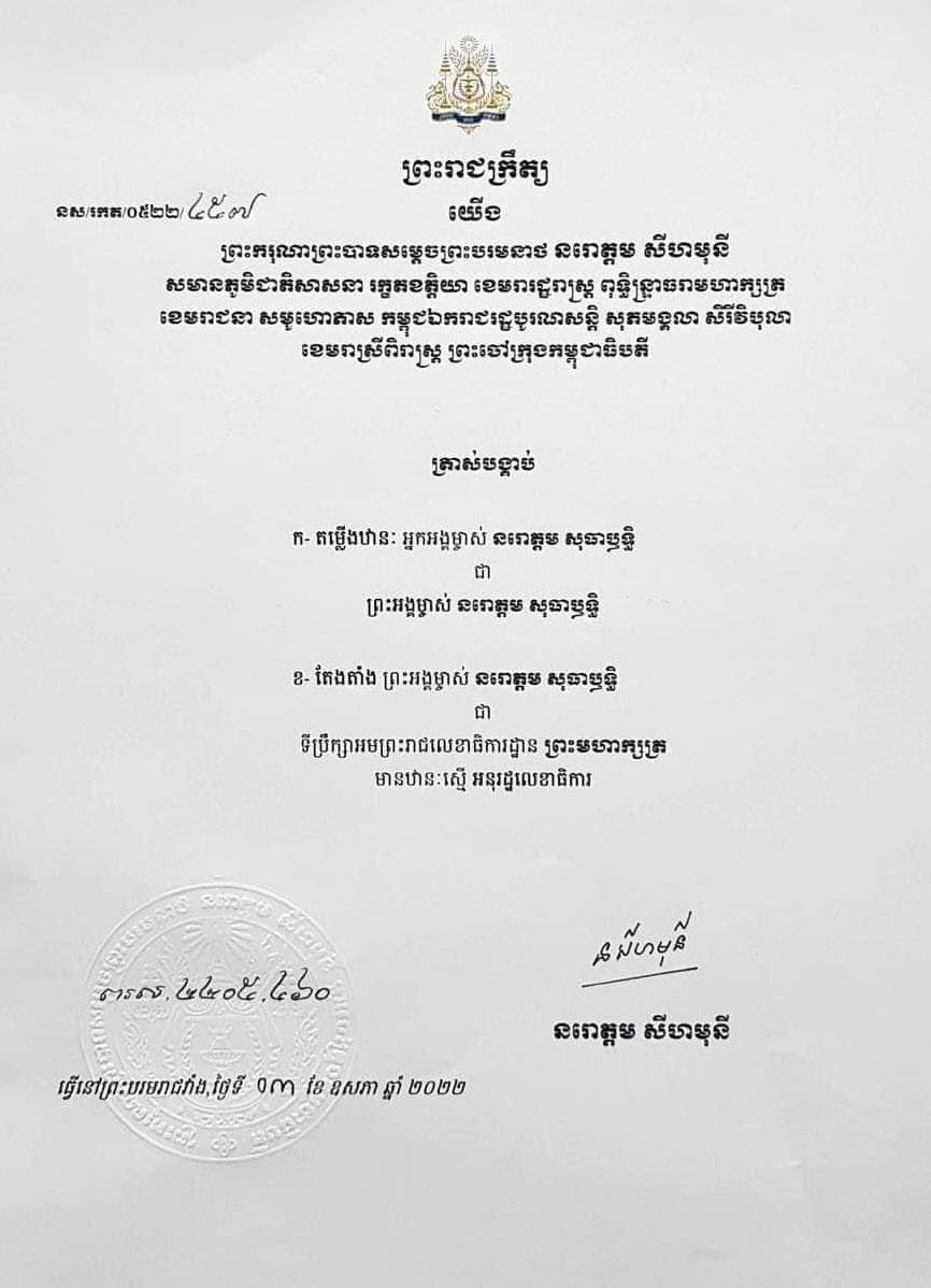 ព្រះមហាក្សត្រ ចេញព្រះរាជក្រឹត្យតម្លើងឋានៈអ្នកអង្គម្ចាស់ នរោត្តម សុធាឫទ្ធិ ជា «ព្រះអង្គម្ចាស់ នរោត្តម សុធាឫទ្ធិ» និងតែងតាំងជាទីប្រឹក្សាអមព្រះរាជលេខាធិការដ្ឋានព្រះមហាក្សត្រ