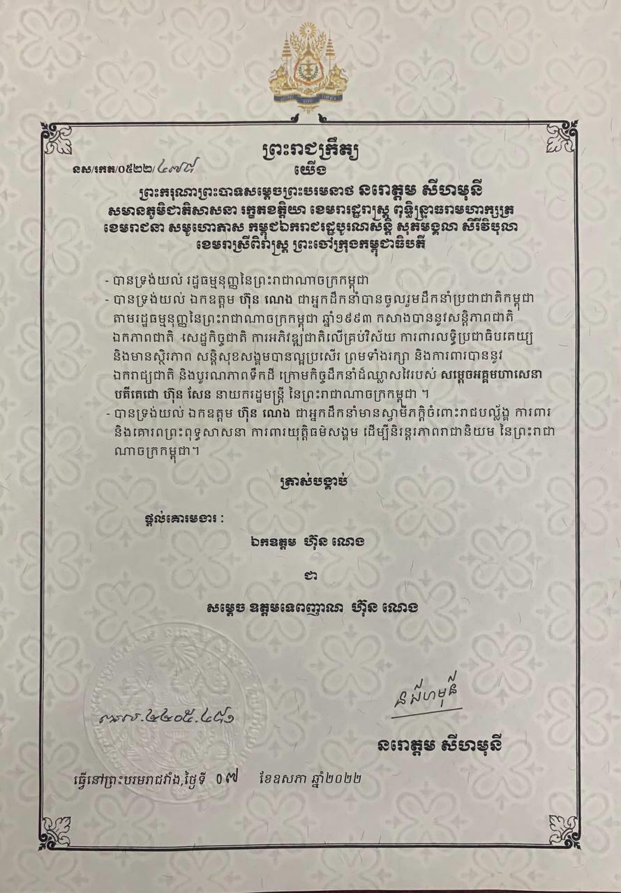 ព្រះមហាក្សត្រ ត្រាស់បង្គាប់ផ្ដល់គោរមងារដល់ឯកឧត្តម ហ៊ុន ណេង ជា «សម្ដេចឧត្ដមទេពញាណ»