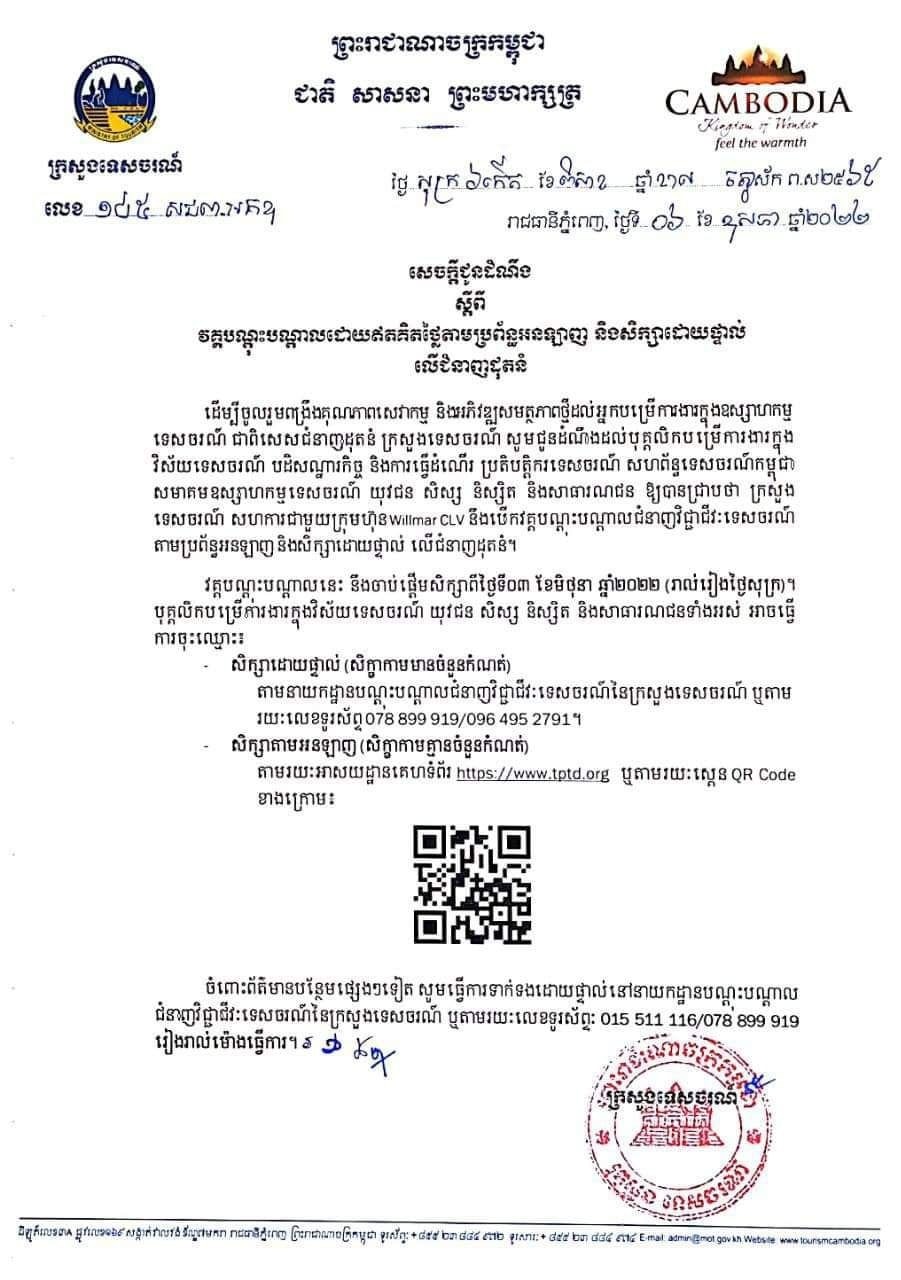 វគ្គបណ្ដុះបណ្ដាលនេះ នឹងចាប់ផ្ដើមសិក្សាពីថ្ងៃទី០៣ ខែមិថុនា ឆ្នាំ២០២២ (រាល់រៀងថ្ងៃសុក្រ) បុគ្គលិកបម្រើការងារក្នុងវិស័យទេសចរណ៍ យុវជន សិស្ស និស្សិត និងសាធារណជនទាំងអស់ អាចធ្វើការចុះឈ្មោះ៖
