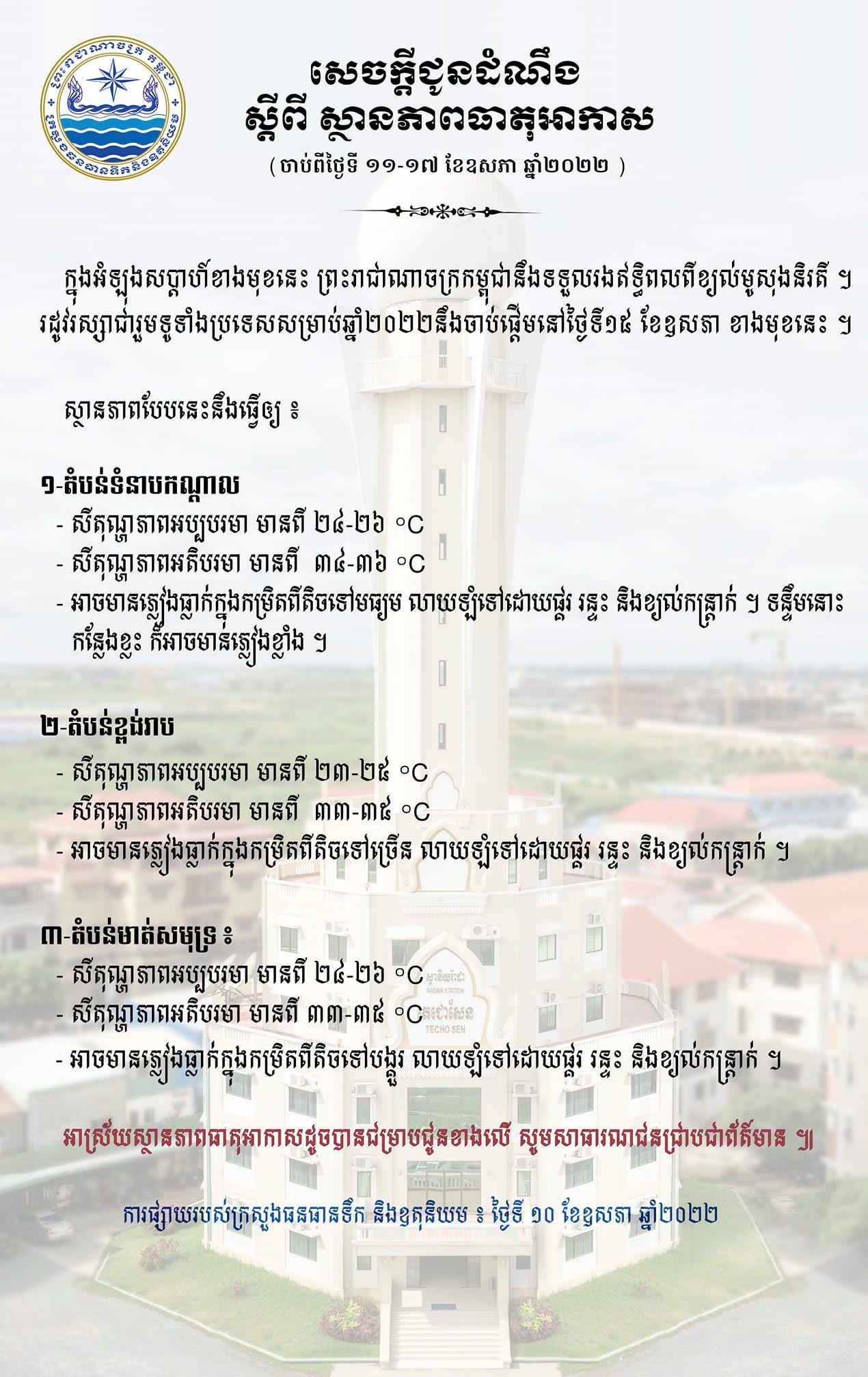 រាជធានីភ្នំពេញ៖ យោងតាមការចុះផ្សាយរបស់ ក្រសួងធនធានទឹក និងឧតុនិយម នៅថ្ងៃទី១០ ខែឧសភា ឆ្នាំ២០២២ បានចេញសេចក្ដីជូនដំណឹងស្ដីពី ស្ថានភាពធាតុអាកាស ចាប់ពីថ្ងៃទី១១ ដល់ថ្ងៃទី១៧ ខែឧសភា ឆ្នាំ២០២២ បានឲ្យដឹងថា ក្នុងអំឡុងសប្តាហ៍ខាងមុខនេះ ព្រះរាជាណាចក្រកម្ពុជា នឹងទទួលរងឥទ្ធិពលពីខ្យល់មូសុងនិរតី។ រដូវវស្សាជារួមទូទាំងប្រទេស សម្រាប់ឆ្នាំ២០២២ នឹងចាប់ផ្តើមនៅថ្ងៃទី១៥ ខែឧសភា ខាងមុខនេះ។