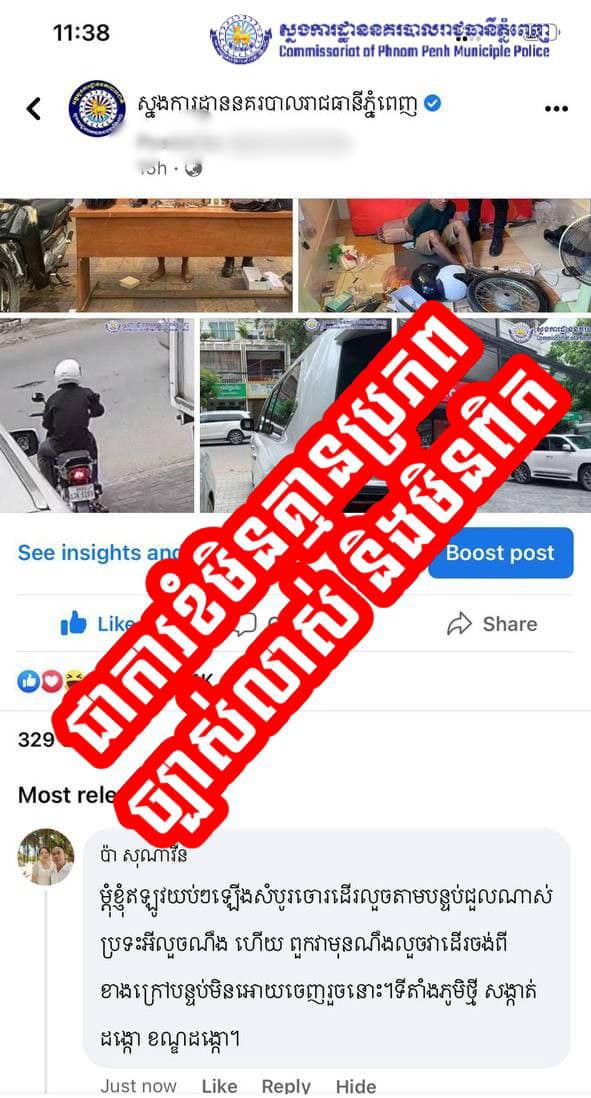 រាជធានីភ្នំពេញ៖ យោងតាមការចុះផ្សាយរបស់ ស្នងការដ្ឋាននគរបាលរាជធានីភ្នំពេញ នៅថ្ងៃទី១០ ខែឧសភា ឆ្នាំ២០២២ បានសេចក្តីបកស្រាយបំភ្លឺព័ត៌មាន និងបដិសេធ របស់ក្រុមការងារព័ត៌មាន និងប្រតិកម្មរហ័សនៃស្នងការដ្ឋាននគរបាលរាជធានីភ្នំពេញ ទាក់ទងទៅនឹងការខំមិនព័ត៌មានគ្មានប្រភពច្បាស់លាស់ និងជាព័ត៌មានមិនពិតត្រឹមលឺគេថាសោះ បែរជាយកមកខំមិនចូលផេកស្នងការ នៅព័ត៌មានមិនពិត ដែលធ្វើឱ្យមជ្ឈដ្ឋានទូទៅមានការយល់ច្រឡំ។