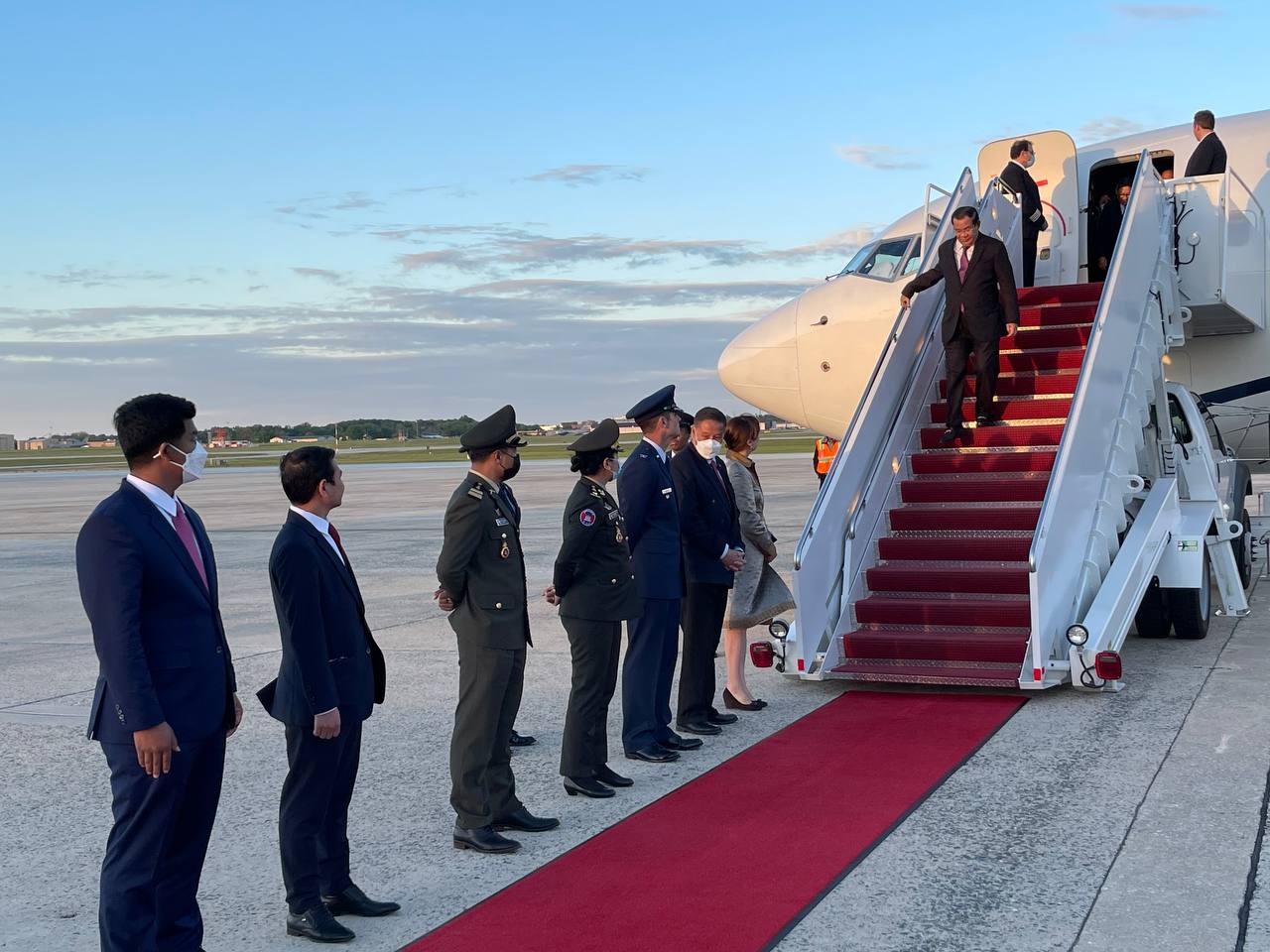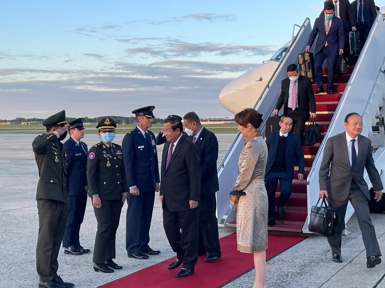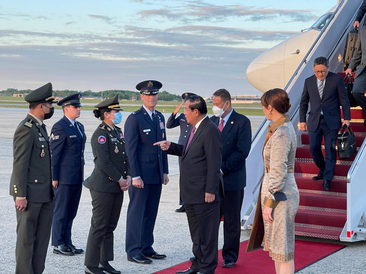 នៅអាកាសយានដ្ឋានអន្តរជាតិ Joint Base Andrews រដ្ឋធានីវ៉ាស៊ិនតោន សហរដ្ឋអាមេរិក វត្តមាននៃការអញ្ជើញដល់របស់ សម្តេចតេជោនាយករដ្ឋមន្រ្តី និងគណៈប្រតិភូជាន់ខ្ពស់រាជរដ្ឋាភិបាលកម្ពុជា ត្រូវបានការធ្វើគារវកិច្ចស្វាគមន៍យ៉ាងស្និទ្ធស្នាលបំផុត ពីឥស្សរជនជាន់ខ្ពស់ ពិធីការក្រសួង ការបរទេសសហរដ្ឋអាមេរិក ឯកឧត្តម កែវ ជា ឯកអគ្គរាជទូតវិសាមញ និងពេញសមត្ថភាព នៃព្រះរាជាណាចក្រកម្ពុជា ប្រចាំសហរដ្ឋអាមេរិក ព្រមទាំងវត្តមាន ឯកឧត្តម លោកជំទាវ ជាឥស្សរជនជាន់ខ្ពស់សហរដ្ឋអាមេរិក និងឥស្សរជនការទូតរបស់ព្រះរាជាណាចក្រកម្ពុជា ប្រចាំរដ្ឋធានីវ៉ាស៊ិនតោន ជាច្រើនរូប។
