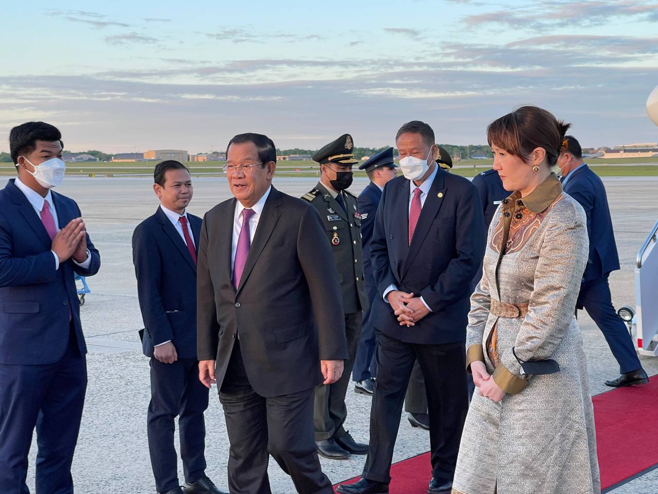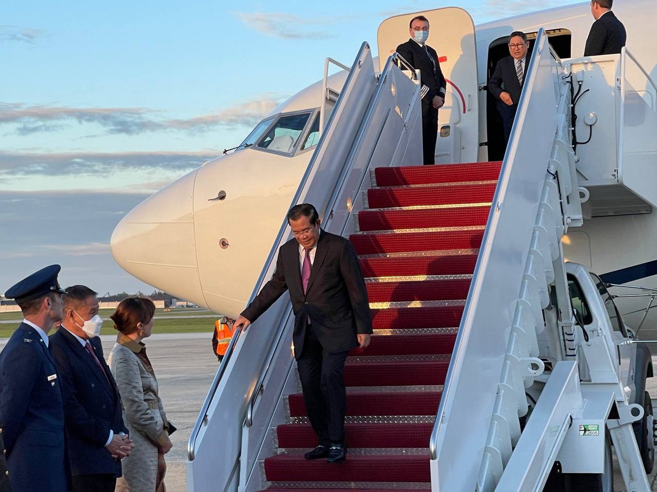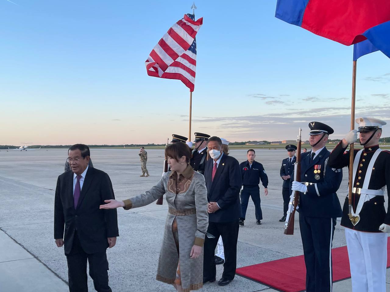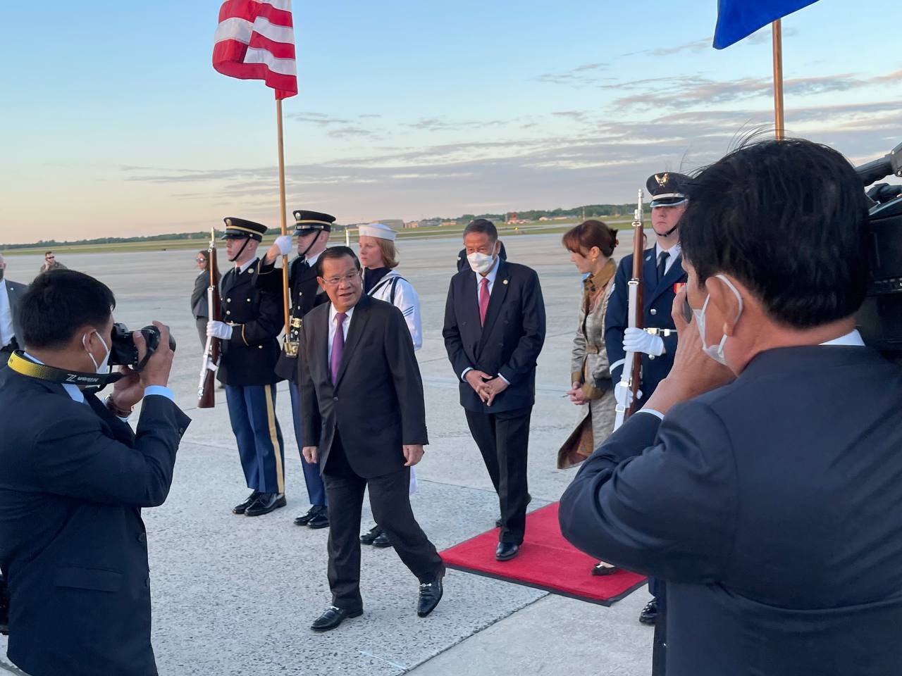 នៅអាកាសយានដ្ឋានអន្តរជាតិ Joint Base Andrews រដ្ឋធានីវ៉ាស៊ិនតោន សហរដ្ឋអាមេរិក វត្តមាននៃការអញ្ជើញដល់របស់ សម្តេចតេជោនាយករដ្ឋមន្រ្តី និងគណៈប្រតិភូជាន់ខ្ពស់រាជរដ្ឋាភិបាលកម្ពុជា ត្រូវបានការធ្វើគារវកិច្ចស្វាគមន៍យ៉ាងស្និទ្ធស្នាលបំផុត ពីឥស្សរជនជាន់ខ្ពស់ ពិធីការក្រសួង ការបរទេសសហរដ្ឋអាមេរិក ឯកឧត្តម កែវ ជា ឯកអគ្គរាជទូតវិសាមញ និងពេញសមត្ថភាព នៃព្រះរាជាណាចក្រកម្ពុជា ប្រចាំសហរដ្ឋអាមេរិក ព្រមទាំងវត្តមាន ឯកឧត្តម លោកជំទាវ ជាឥស្សរជនជាន់ខ្ពស់សហរដ្ឋអាមេរិក និងឥស្សរជនការទូតរបស់ព្រះរាជាណាចក្រកម្ពុជា ប្រចាំរដ្ឋធានីវ៉ាស៊ិនតោន ជាច្រើនរូប។