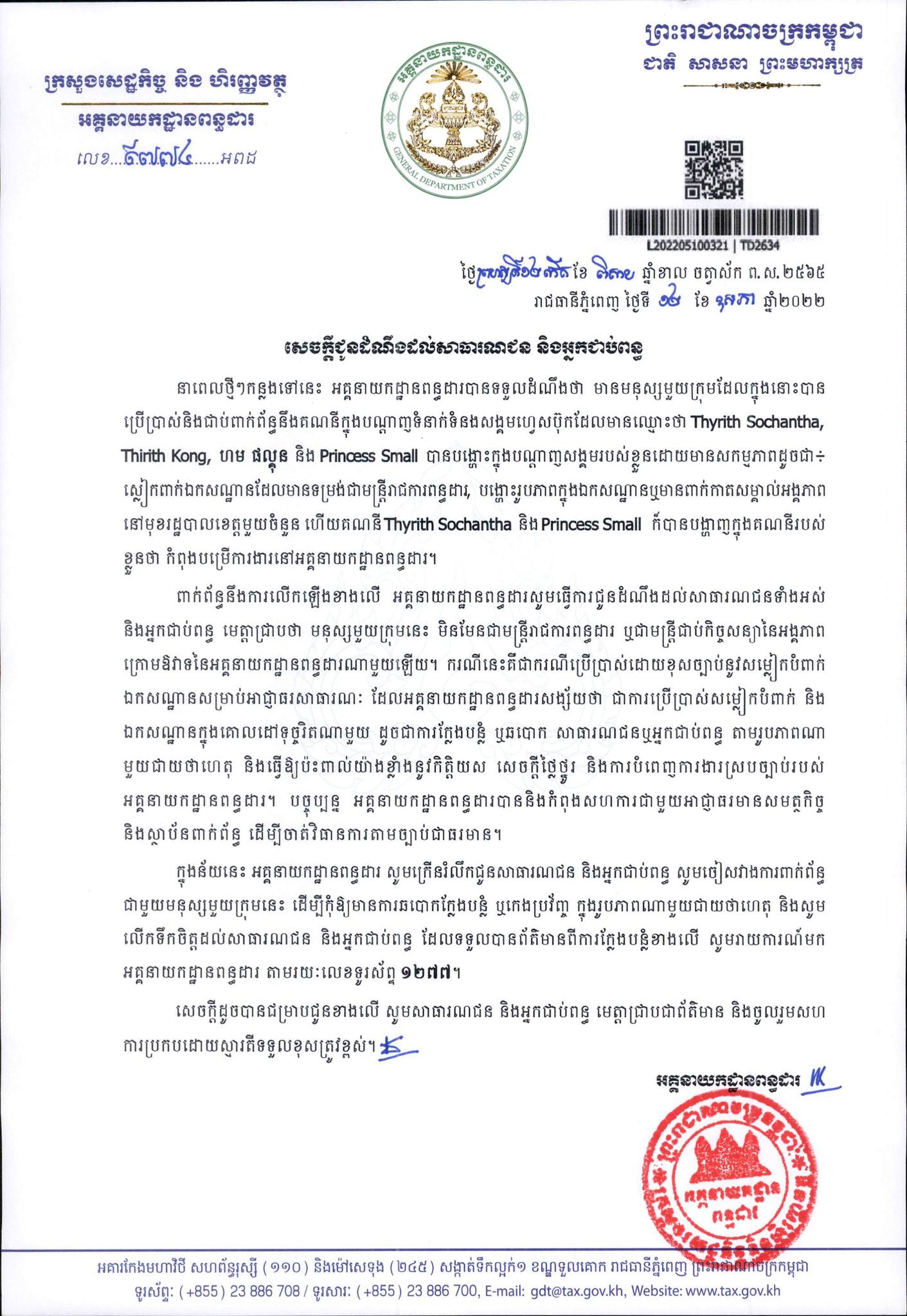 នាថ្ងៃទី១២ ខែឧសភា ឆ្នាំ២០២២ អគ្គនាយកដ្ឋានពន្ធដារ បានចេញសេចក្តីជូនដំណឹងថា មានមនុស្សមួយក្រុមដែលក្នុងនោះបានប្រើប្រាស់ និងជាប់ពាក់ព័ន្ធនឹងគណនីក្នុងបណ្តាញទំនាក់ទំនងសង្គមហ្វេសប៊ុកដែលមានឈ្មោះ Thyrith Sochantha, Thirith Kong, ហម ផល្គុន និង Princess Small បានបង្ហោះក្នុងបណ្តាញសង្គមរបស់ខ្លួនដោយមានសកម្មភាពដូចជា៖ ស្លៀកពាក់ឯកសណ្ឋានដែលមានទម្រង់ជាមន្ត្រីរាជការពន្ធដារ, បង្ហោះរូបភាពក្នុងឯកសណ្ឋាន ឬមានពាក់កាតសម្គាល់អង្គភាពនៅមុខរដ្ឋបាលខេត្តមួយចំនួន ហើយគណនី Thyrith Sochantha និង Princess Small ក៏បានបង្ហាញក្នុងគណនីរបស់ខ្លួនថា កំពុងបម្រើការនៅអគ្គនាយកដ្ឋានពន្ធដារ។