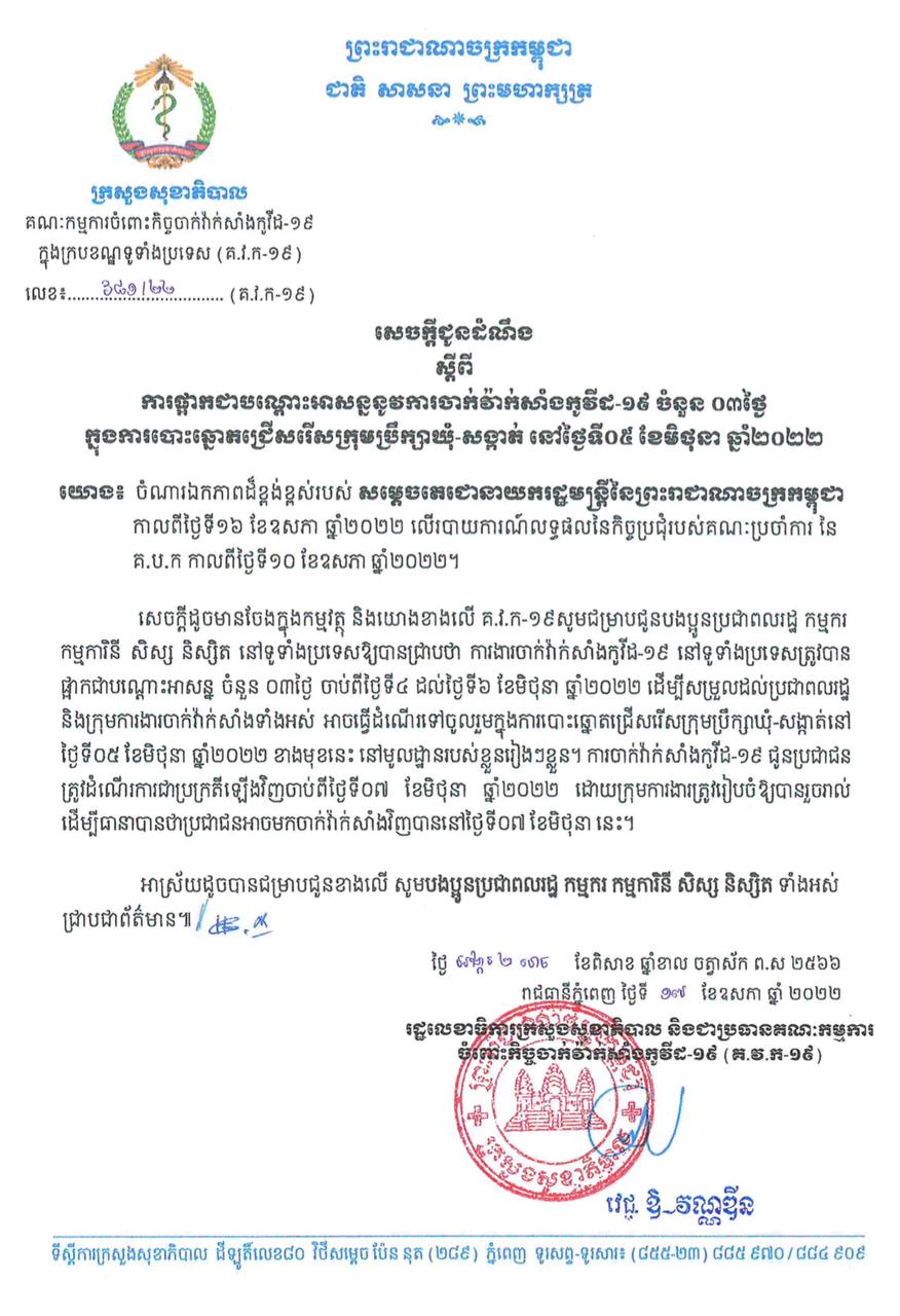 ក្រសួងសុខាភិបាល សូមជម្រាបជូនបងប្អូនប្រជាពលរដ្ឋ កម្មករ កម្មការិនី សិស្ស និស្សិត នៅទូទាំងប្រទេសឲ្យបានជ្រាបថា ការងារចាក់វ៉ាក់សាំងកូវីដ-១៩ នៅទូទាំងប្រទេសត្រូវបានផ្អាកជាបណ្ដោះអាសន្ន ចំនួន ០៣ថ្ងៃ ចាប់ពីថ្ងៃទី០៤ ដល់ថ្ងៃទី០៦ ខែមិថុនា ឆ្នាំ២០២២ ដើម្បីសម្រួលដល់ប្រជាពលរដ្ឋ និងក្រុមការងារចាក់វ៉ាក់សាំងទាំងអស់ អាចធ្វើដំណើរទៅចូលរួមក្នុងការបោះឆ្នោតក្រុមប្រឹក្សាឃុំសង្កាត់ នៅមូលដ្ឋានរបស់ខ្លួនរៀងៗខ្លួន។ ការចាក់វ៉ាក់សាំងកូវីដ-១៩ ជូនប្រជាពលរដ្ឋត្រូវដំណើរការជាប្រក្រតីឡើងវិញចាប់ពីថ្ងៃទី០៧ ខែមិថុនា ឆ្នាំ២០២២ ដោយក្រុមការងារត្រូវរៀបចំឲ្យបានរួចរាល់ ដើម្បីធានាបានថាប្រជាជនអាចមកចាក់វ៉ាក់សាំងវិញបាននៅថ្ងៃទី០៧ ខែមិថុនានេះ ៕