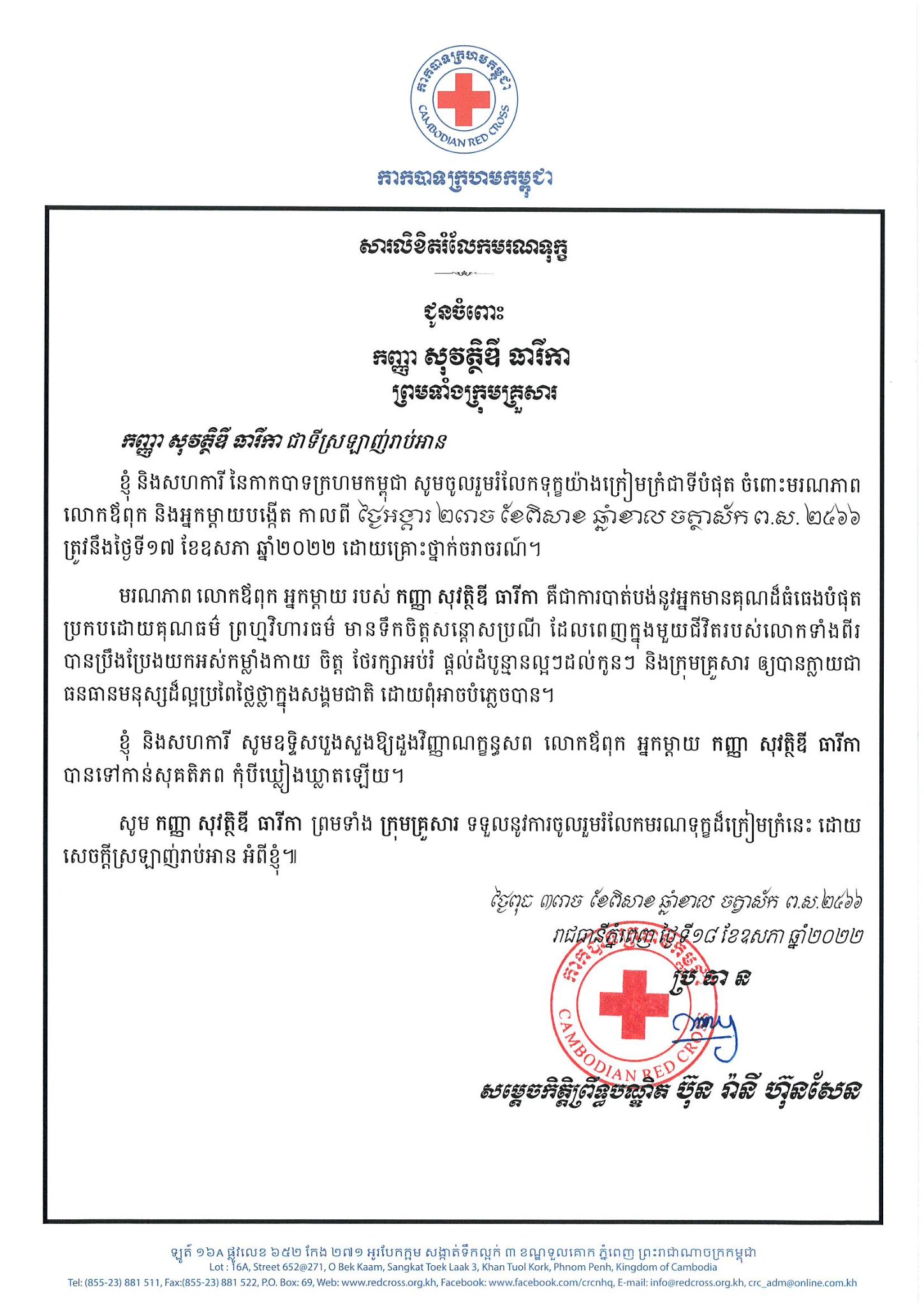 ស្ថិតក្នុងមរណទុក្ខដ៏ក្រៀមក្រំនេះ សម្តេចកិត្តិព្រឹទ្ធបណ្ឌិត និងសហការីទាំងអស់ សូមបួងសួងដល់គុណបុណ្យព្រះរតនត្រ័យ និងវត្ថុស័ក្តិសិទ្ធិក្នុងលោកទាំងអស់ សូមប្រោសដួងវិញ្ញាណក្ខន្ធ លោកឪពុក អ្នកម្តាយ របស់ កញ្ញា សុវត្ថិឌី ធារីកា បានទៅកាន់ក្នុងសុគតិភពជានិច្ចនិរន្តរ៍ កុំបីឃ្លៀងឃ្លាតឡើយ៕