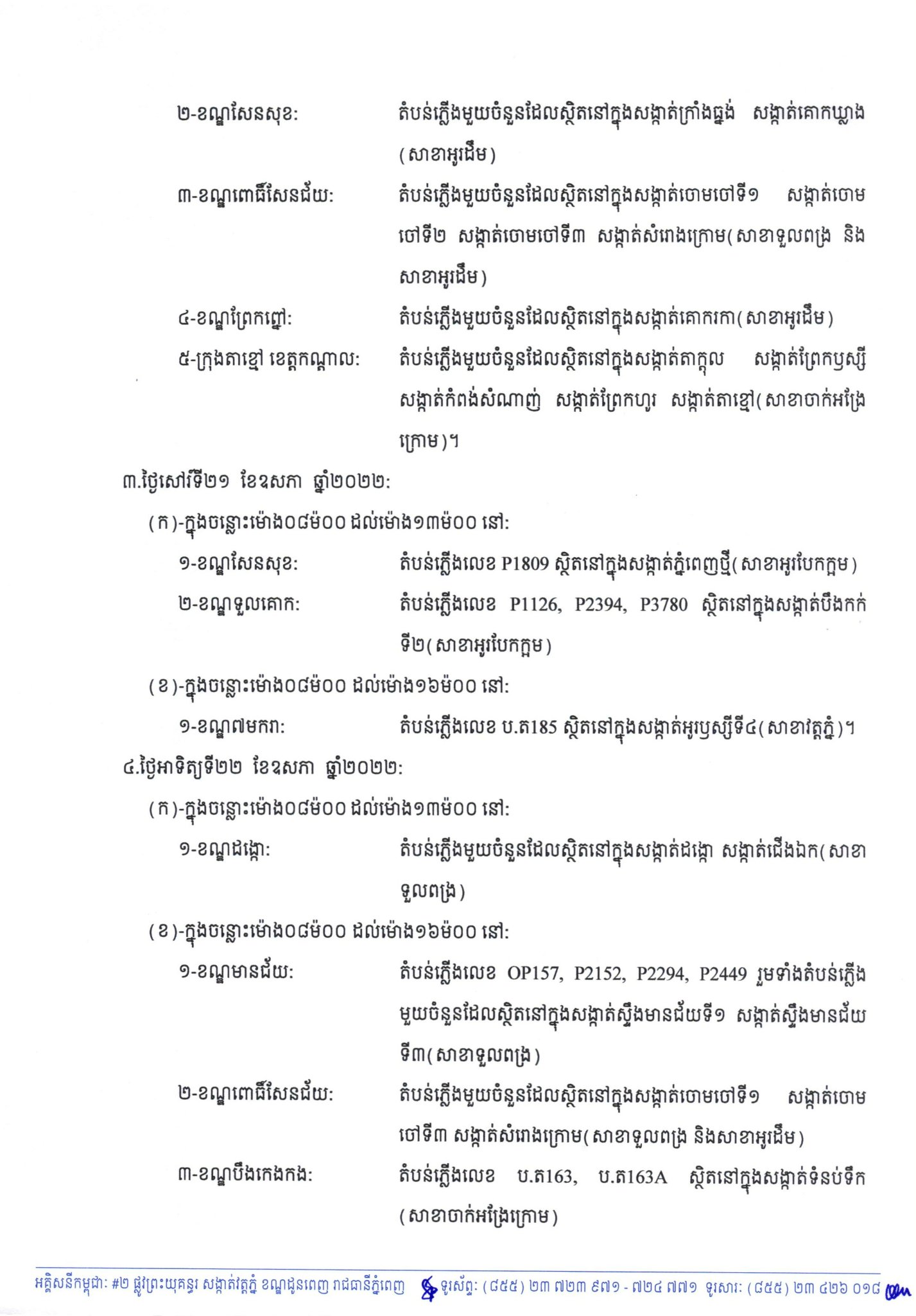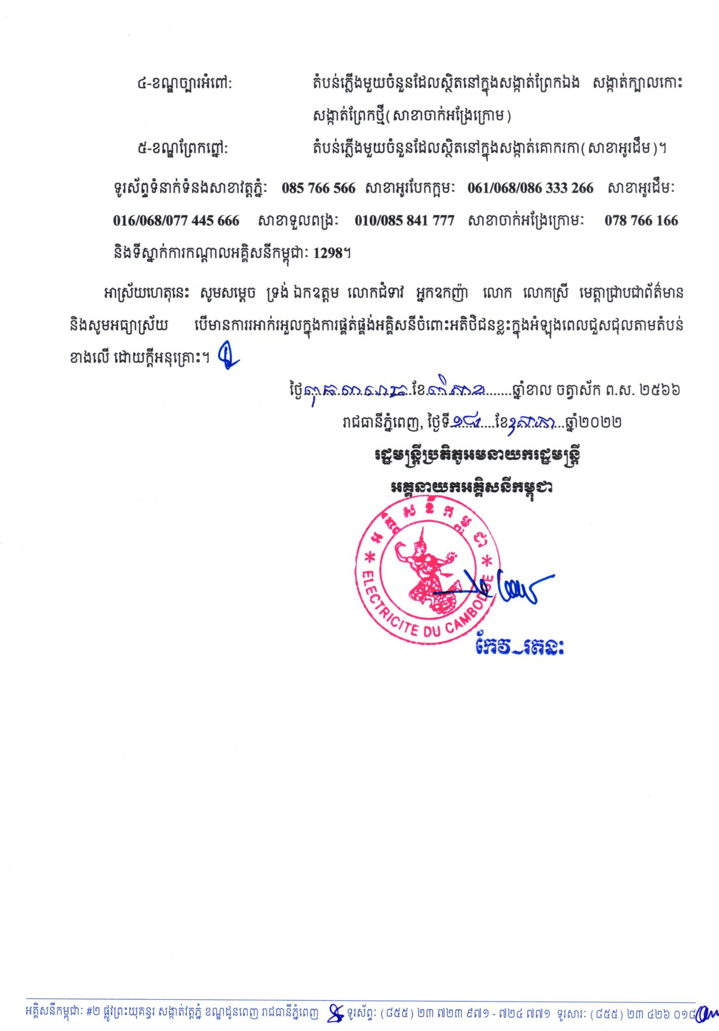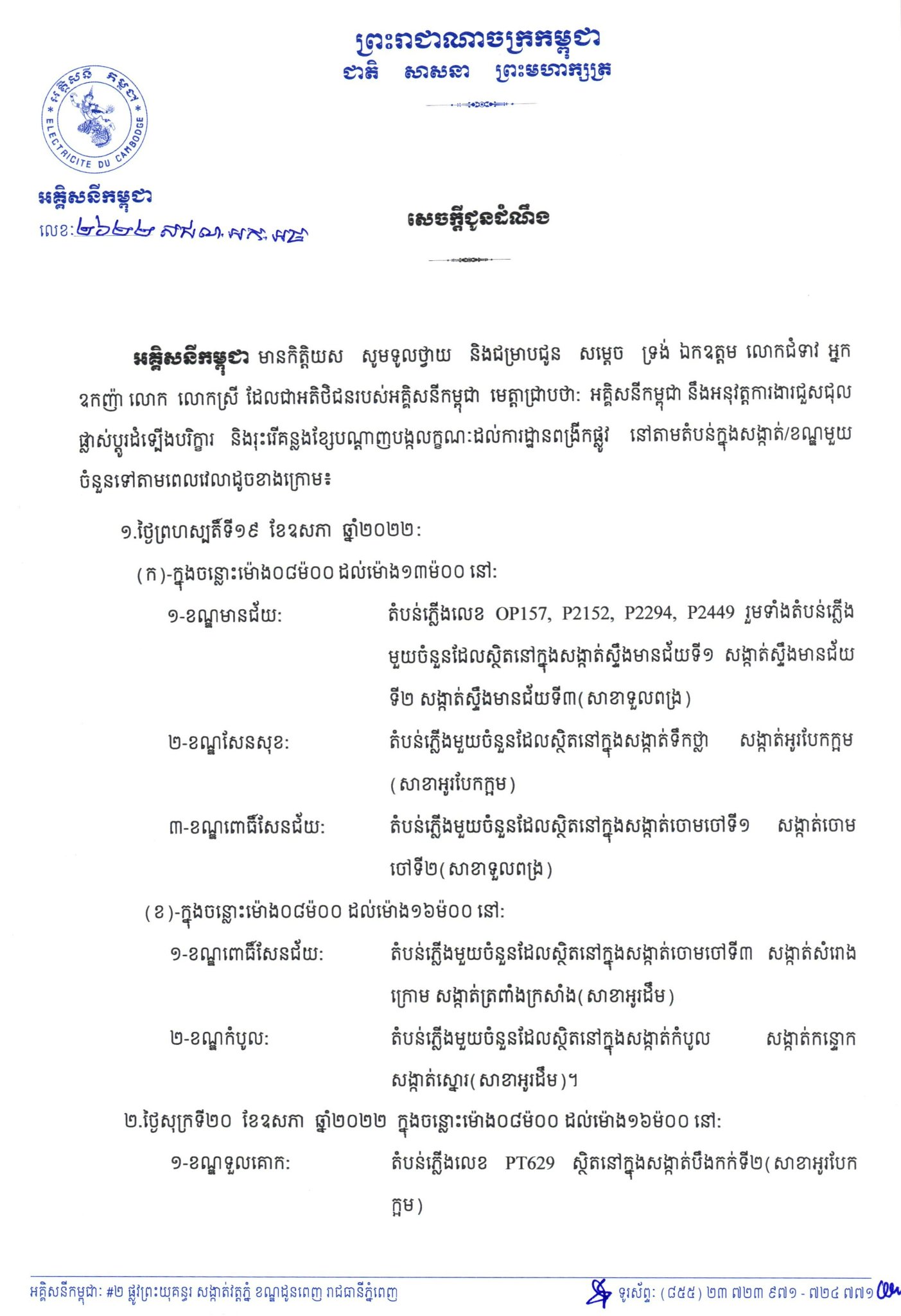 រាជធានីភ្នំពេញ៖ យោងតាមការចុះផ្សាយរបស់ អគ្គិសនីកម្ពុជា នៅថ្ងៃទី១៨ ខែឧសភា ឆ្នាំ២០២២ បានចេញសេចក្តីជូនដំណឹងស្តីពីការអនុវត្តការងារជួសជុល ផ្លាស់ប្តូរ តម្លើងបរិក្ខារនានា និងរុះរើគន្លងខ្សែបណ្តាញអគ្គិសនីរបស់អគ្គិសនីកម្ពុជា ដើម្បីបង្កលក្ខណៈងាយស្រួលដល់ការដ្ឋានពង្រីកផ្លូវ នៅថ្ងៃទី១៩ ខែឧសភា ឆ្នាំ២០២២ ដល់ថ្ងៃទី២២ ខែឧសភា ឆ្នាំ២០២២ នៅតំបន់មួយចំនួនទៅតាមពេលវេលា និងទីកន្លែងដូចសេចក្តីជូនដំណឹងលម្អិតខាងក្រោម។