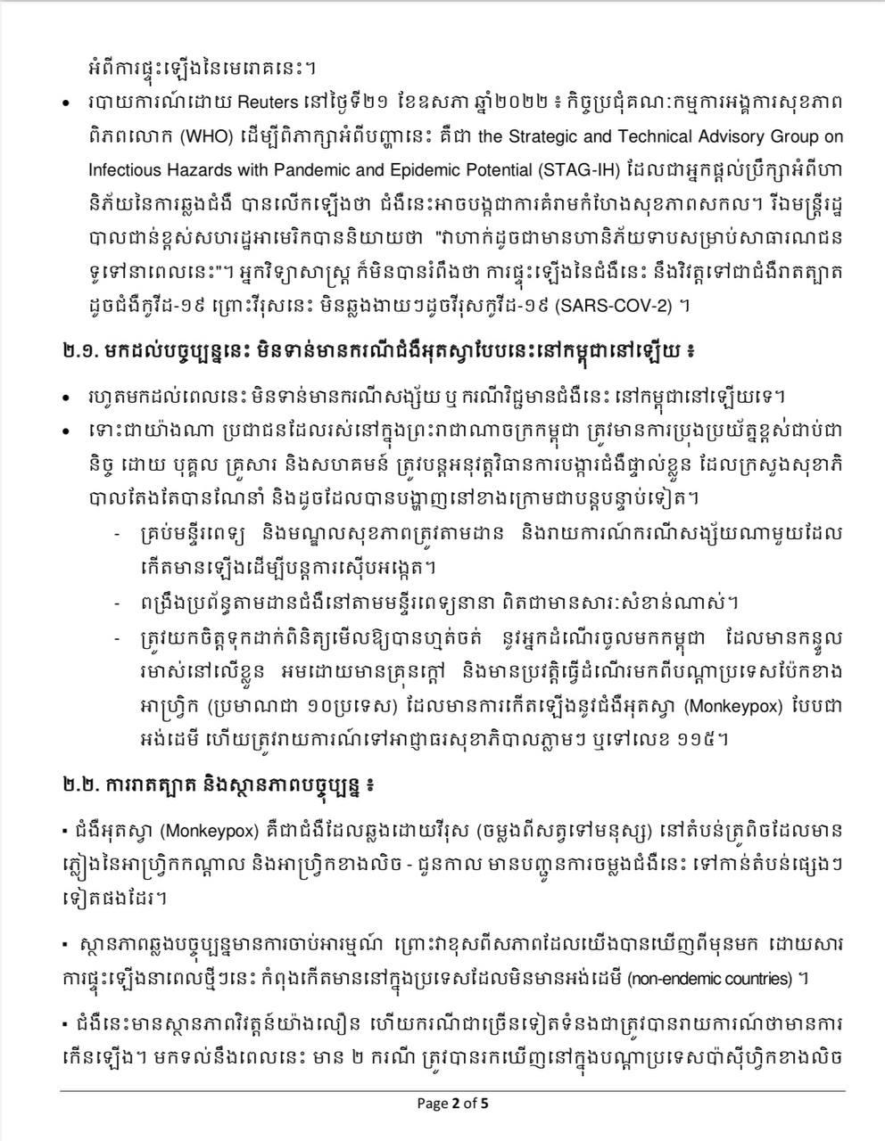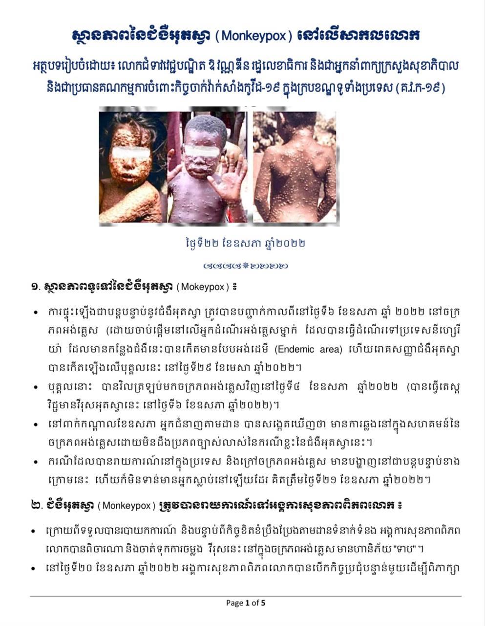 រាជធានីភ្នំពេញ៖ យោងតាមការចុះផ្សាយរបស់ ក្រសួងសុខាភិបាល នៅថ្ងៃទី២៣ ខែឧសភា ឆ្នាំ២០២២ បានចេញសេចក្ដីជូនដំណឹង ស្ដីពីស្ថានភាពនៃជំងឺអុតស្វា (Monkeypox) នៅលើសកលលោក ដែលផ្តើមចេញពីប្រទេសអង់គ្លេស។