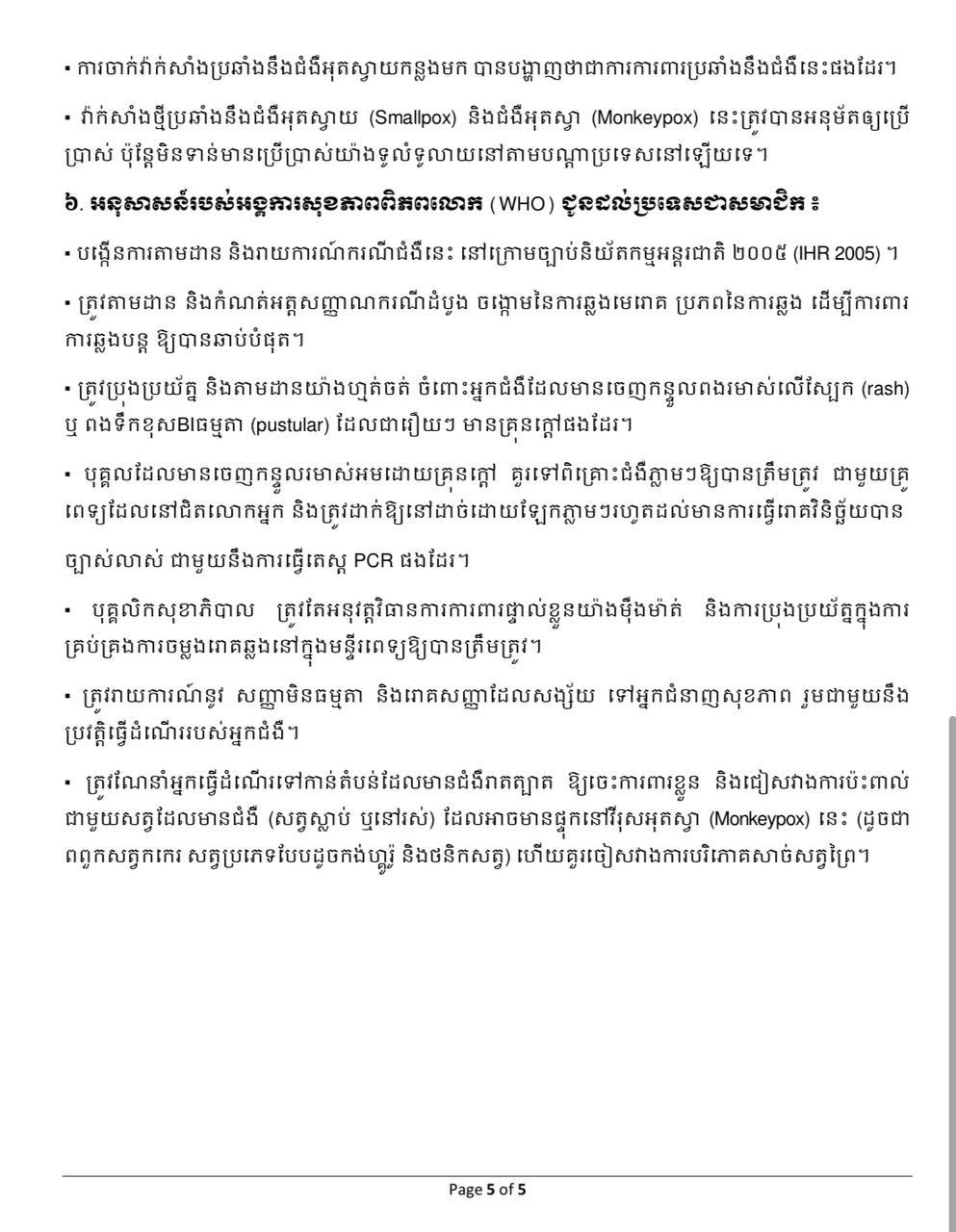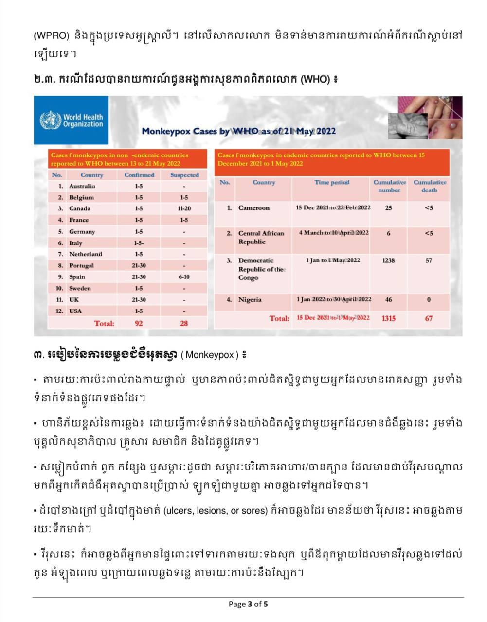 ជាមួយគ្នានេះ លោកស្រីបានជំរុញឲ្យយកចិត្តទុកដាក់ពិនិត្យមើលឱ្យបានហ្មត់ចត់ នូវអ្នកដំណើរចូលមកកម្ពុជា ដែលមានកន្ទួលរមាស់នៅលើខ្លួន អមដោយមានគ្រុនក្តៅ និងមានប្រវត្តិធ្វើដំណើរមកពីបណ្តាប្រទេសប៉ែកខាងអាហ្វ្រិក (ប្រមាណជា ១០ប្រទេស) ដែលមានការកើតឡើងនូវជំងឺអុតស្វា (Monkeypox) បែបជាអង់ដេមី ហើយត្រូវរាយការណ៍ទៅអាជ្ញាធរសុខាភិបាលភ្លាមៗ ឬទៅលេខ ១១៥៕