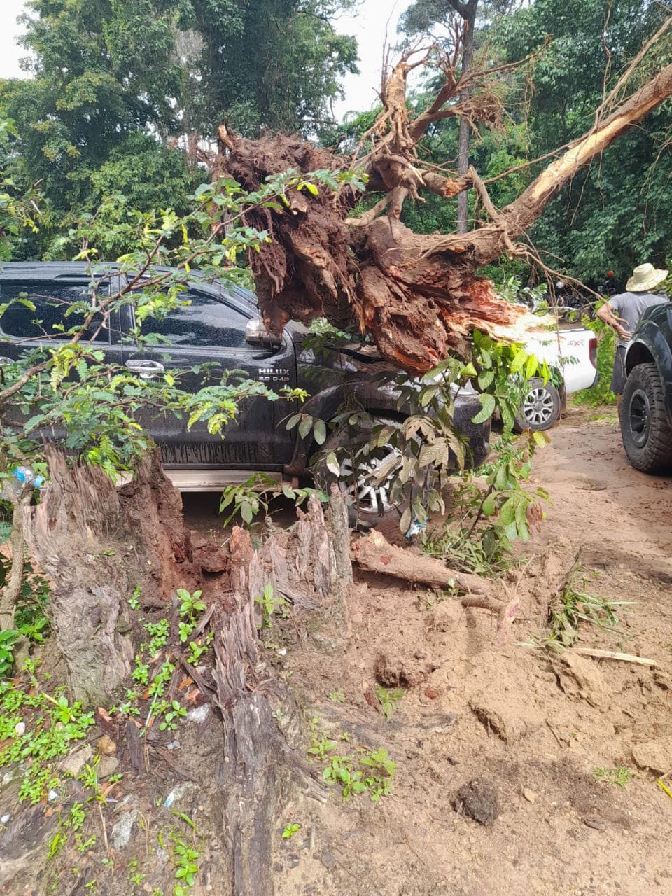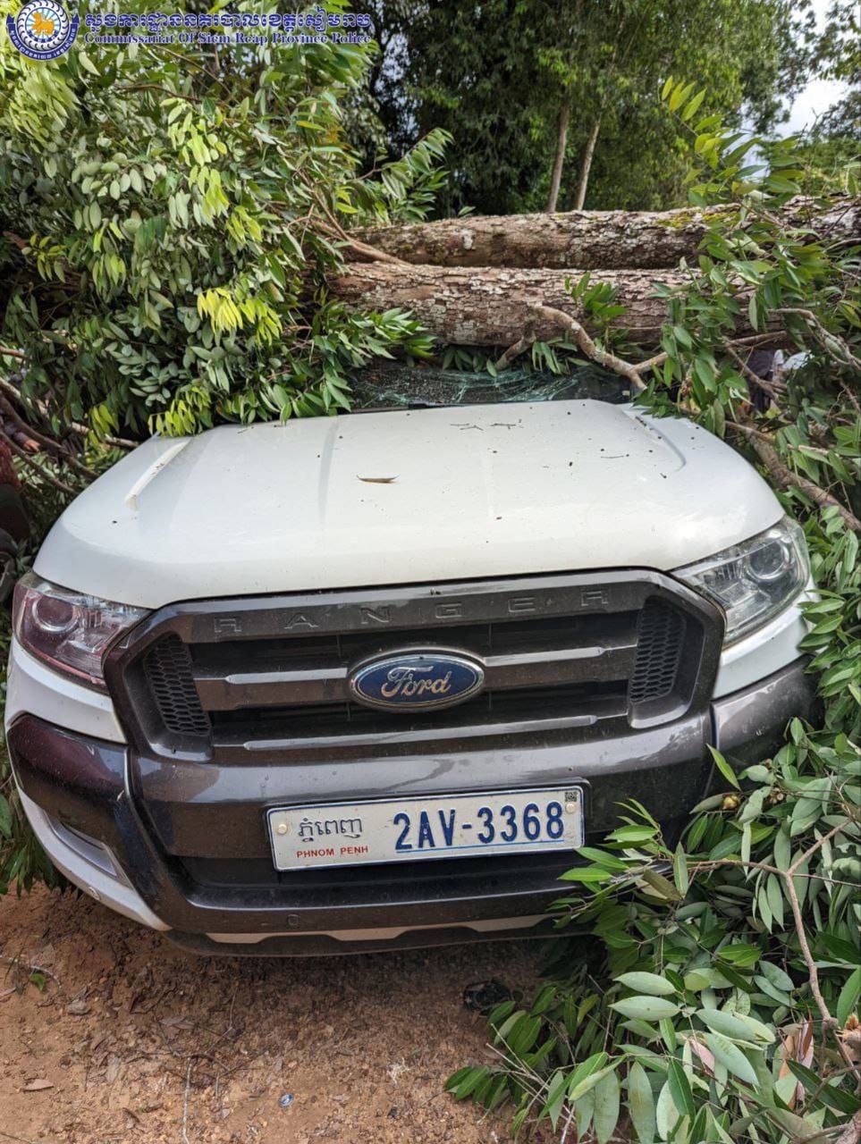 ដើមឈើបុស្សនាគ បាក់រលំឈើសង្កត់រថយន្តចំនួន ០៣គ្រឿង ខូចខាតយ៉ាងដំណំ នៅចំណុចចំណតរថយន្ដទឹកធ្លាក់ជាន់ទី៣ ទឹកជ្រោះភ្នំគូលែន