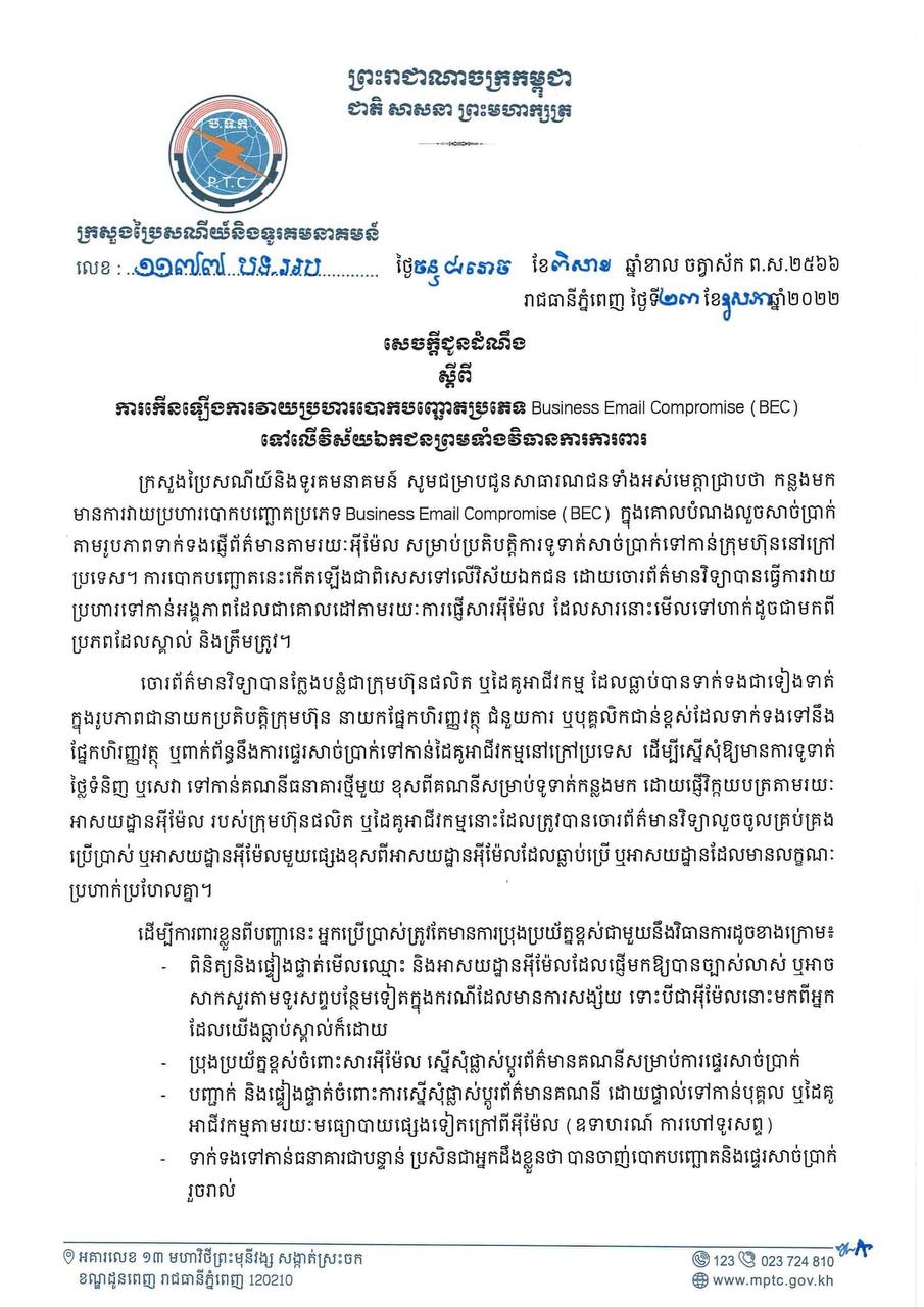 ក្រសួងប្រៃសណីយ៍ជូនដំណឹងអំពី ការកើនឡើងការវាយប្រហារបោកបញ្ឆោតប្រភេទ Business Email Compromise ទៅលើវិស័យឯកជន ព្រមទាំងវិធានការការពារ