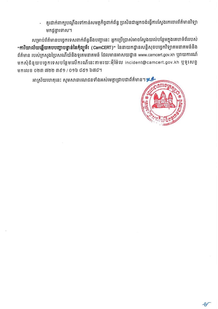 សម្រាប់ព័ត៌មានបច្ចេកទេសពាក់ព័ន្ធនឹងបញ្ហានេះ អ្នកប្រើប្រាស់អាចស្វែងយល់បន្ថែមក្នុងគេហទំព័ររបស់ “ការិយាល័យឆ្លើយតបបញ្ហាបន្ទាន់នៃកុំព្យូទ័រ (CamCERT)” នៃនាយកដ្ឋានសន្តិសុខបច្ចេកវិទ្យាគមនាគមន៍និងព័ត៌មាន របស់ក្រសួងប្រៃសណីយ៍និងទូរគមនាគមន៍ ដែលមានអាសយដ្ឋាន www.camcert.gov.kh ឬរាយការណ៍ ឬសុំជំនួយបច្ចេកទេសបន្ថែមលើករណីនេះតាមរយៈអ៊ីម៉ែល incident@camcert.gov.kh ឬទូរសព្ទលេខ ០២៣ ៧២២ ៣៩១ / ០១៦ ៨៥១ ៦៧៨។ សេចក្តីដូចបានជម្រាបជូនខាងលើ សូមសាធារណជនទាំងអស់មេត្តាជ្រាបជាព័ត៌មាន ៕