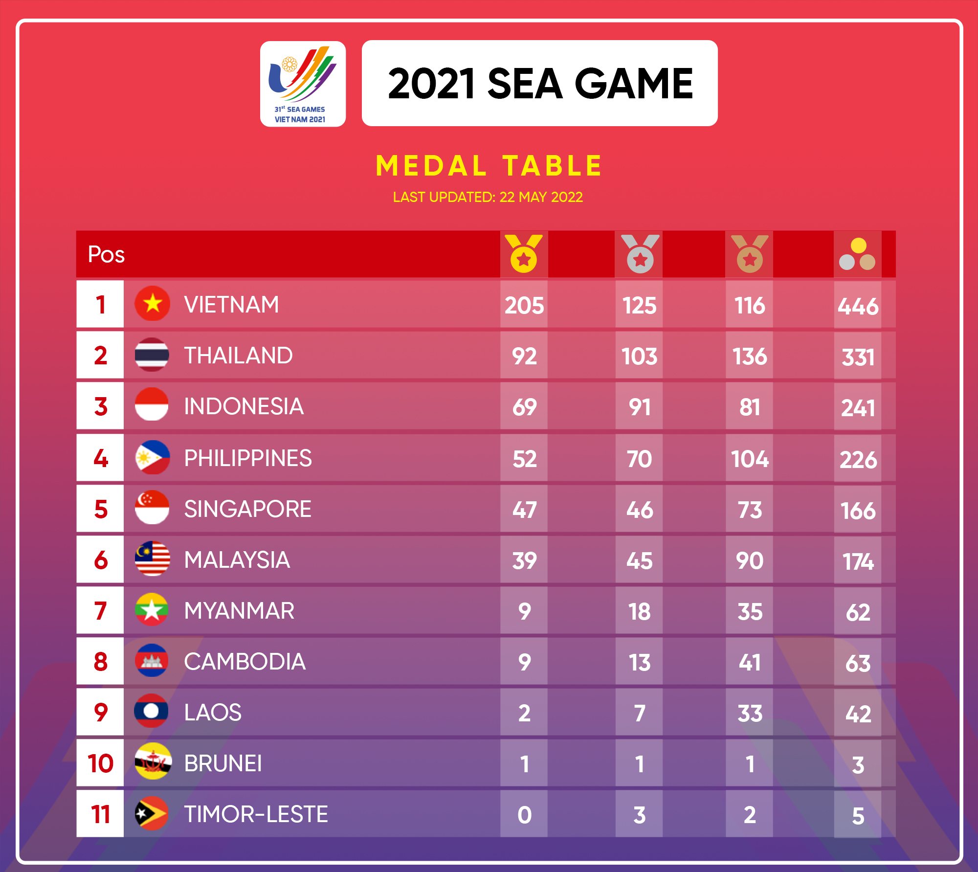 យោងតាមការចុះផ្សាយពីគណនីហ្វេសប៊ុកផ្ទាល់របស់ ឯកឧត្តម ប្រាក់ សុខុន ឧបនាយករដ្ឋមន្ត្រី រដ្ឋមន្ត្រីក្រសួងការបរទេស និងសហប្រតិបត្តិការអន្តរជាតិ នៅថ្ងៃទី២៤ ខែឧសភា ឆ្នាំ២០២២ បានឲ្យដឹងថា ខ្ញុំសូមចូលរួមអបអរសាទរដល់អត្តពលិកទាំងអស់ ជាពិសេសអត្តពលិកកម្ពុជា ដែលបានចូលរួមប្រកួតកីឡាអាស៊ីអាគ្នេយ៍ (ស៊ីហ្គេម) លើកទី៣១ ក្នុងឆ្នាំនេះ នៅប្រទេសវៀតណាម។ កម្ពុជាបានទទួលមេដាយសរុបចំនួន៦៣៖ មាស៩ ប្រាក់១៣ និង សំរឹទ្ធ៤១។