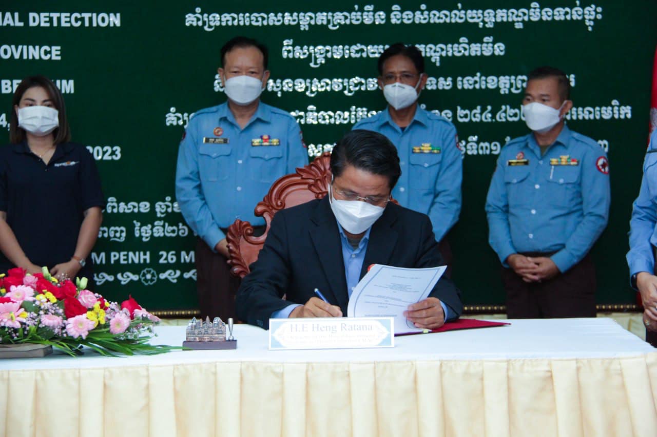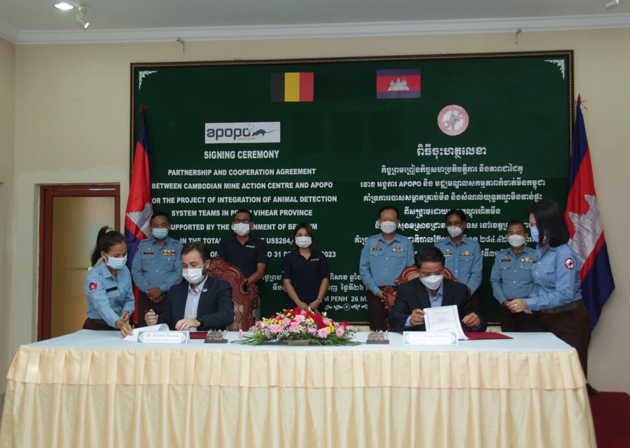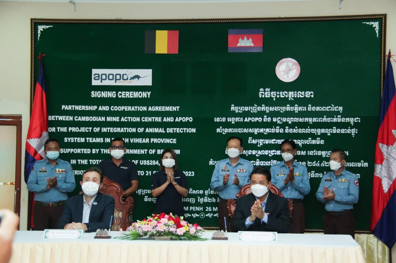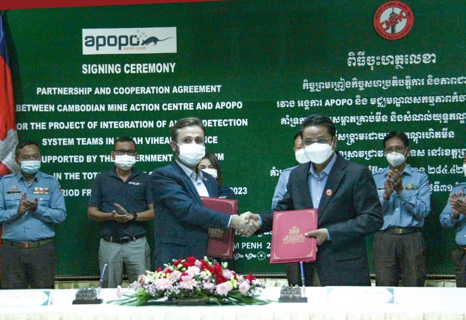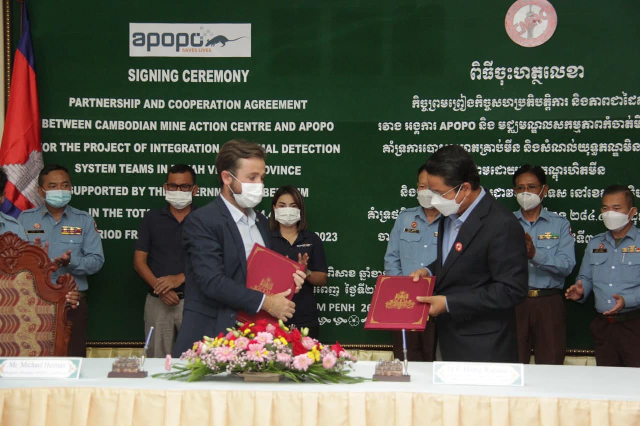 រាជធានីភ្នំពេញ៖ យោងតាមគណនីហ្វេសប៊ុកផ្ទាល់របស់ ឯកឧត្តម ហេង រតនា អគ្គនាយកមជ្ឈមណ្ឌលសកម្មភាពកំចាត់មីនកម្ពុជា (CMAC) បានឲ្យដឹងថា ថ្ងៃព្រហស្បតិ៍ ១១រោច ខែពិសាខ ឆ្នាំខាល ចត្វាស័ក ព.ស២៥៦៦ ត្រូវនឹងថ្ងៃទី២៦ ខែឧសភា ឆ្នាំ២០២២ នៅទីបញ្ជាការ CMAC ភ្នំពេញ ខ្ញុំ និងលោក Michael Heiman ប្រធានអង្គការAPOPO ប្រចាំកម្ពុជា បានចុះហត្ថលេខាលើកិច្ចព្រមព្រៀងដៃគូសហប្រតិបត្តិការ ក្នុងការអនុវត្តគំរោងបោសសម្អាតគ្រាប់មីននិងសំណល់យុទ្ធភណ្ឌមិនទាន់ផ្ទុះពីសង្គ្រាម ដោយធ្វើសមាហរកម្មកំលាំងក្រុមកណ្តុរហិតមីន កំលាំងគ្រឿងចក្រនិងក្រុមស្រាវជ្រាវបច្ចេកទេស។