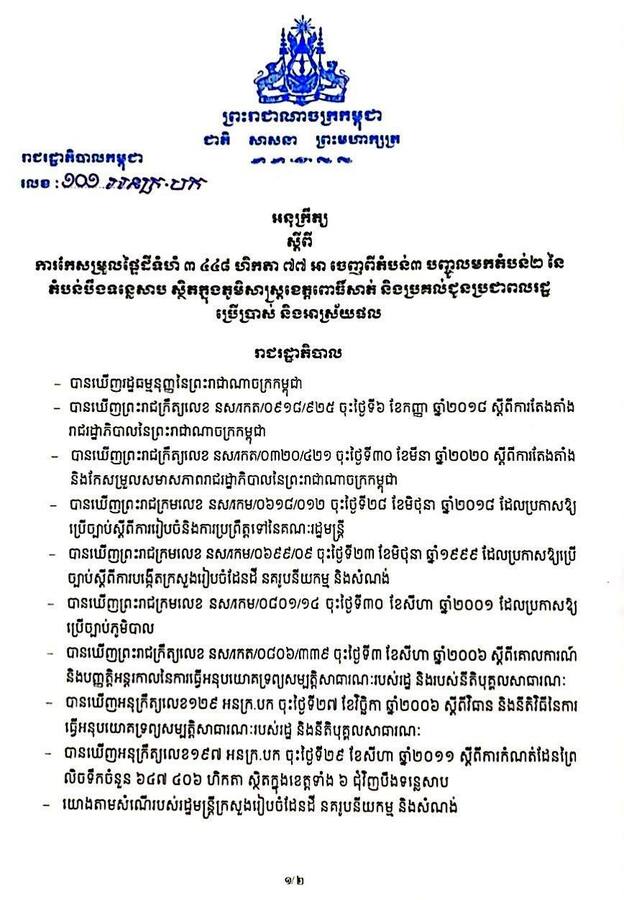 រាជរដ្ឋាភិបាល កែសម្រួលផ្ទៃដីទំហំ ៣ ៤៤៨ ហិកតា ៧៧ អា ចេញពីតំបន់៣ បញ្ចូលមកតំបន់២ នៃតំបន់បឹងទន្លេសាប ស្ថិតក្នុងភូមិសាស្ត្រ ខេត្តពោធិ៍សាត់ និងប្រគល់ជូនប្រជាពលរដ្ឋ ប្រើប្រាស់ និងអាស្រ័យផល
