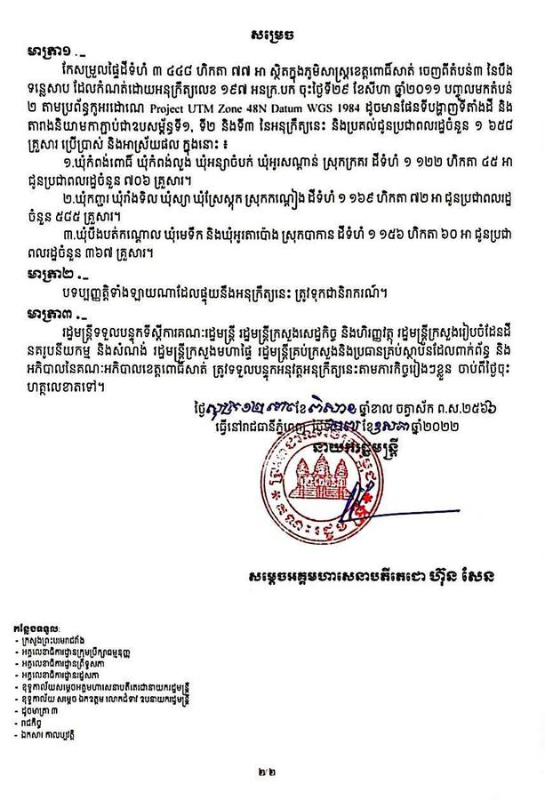 រាជរដ្ឋាភិបាល កែសម្រួលផ្ទៃដីទំហំ ៣ ៤៤៨ ហិកតា ៧៧ អា ស្ថិតក្នុងភូមិសាស្ត្រខេត្តពោធិ៍សាត់ ចេញពីតំបន់៣ នៃបឹងទន្លេសាប ដែលកំណត់ដោយអនុក្រឹត្យលេខ ១៩៧ អនក្រ.បក ចុះថ្ងៃទី២៩ ខែសីហា ឆ្នាំ២០១១ បញ្ចូលមកតំបន់២ តាមប្រព័ន្ធកូអរដោណេ Project UTM Zone 48N Datum WGS 1984 ដូចមានផែនទីបង្ហាញទីតាំងដី និងតារាងនិយាមកាភ្ជាប់ជាឧបសម្ព័ន្ធទី១, ទី២ និងទី៣ នៃអនុក្រឹត្យនេះ និងប្រគល់ជូនប្រជាពលរដ្ឋចំនួន ១,៦៥៨គ្រួសារ ប្រើប្រាស់ និងអាស្រ័យផល ក្នុងនោះ៖