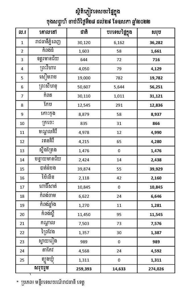 រាជធានីភ្នំពេញ៖ យោងតាមការចុះផ្សាយរបស់ ក្រសួងទេសចរណ៍ នៅថ្ងៃទី៣១ ខែឧសភា ឆ្នាំ២០២២ បានឲ្យដឹងថា ស្ថានភាពភ្ញៀវទេសចរផ្ទៃក្នុងនាចុងសប្តាហ៍ ថ្ងៃទី២៨-២៩ ខែឧសភា ឆ្នាំ២០២២ ភ្ញៀវសរុបមានចំនួន២៧៤,០២៦នាក់ ក្នុងនោះភ្ញៀវជាតិ២៥៩,៣៩៣នាក់ និងភ្ញៀវបរទេសផ្ទៃក្នុង១៤,៦៣៣នាក់។