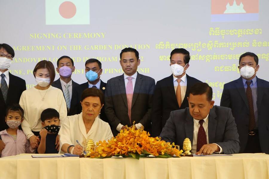 លោកស្រី មិឈិកូ កាន់ហ្សាគិ (MICHIKO KANSAKI) និង លោក ហុក ហូរលីម នាយករងរដ្ឋបាលសាលារាជធានីភ្នំពេញ ជាអ្នកចុះហត្ថ លេខាលើកិច្ចព្រមព្រៀងស្តីពីការប្រគល់ និងទទួលសួនដើមឈើនេះ ដោយឯកឧត្តមឃួង ស្រេង ធ្វើជាសាក្សីនៅពិធីចុះហត្ថលេខាលើកិច្ចព្រមព្រៀង ខាងលើនេះ។
