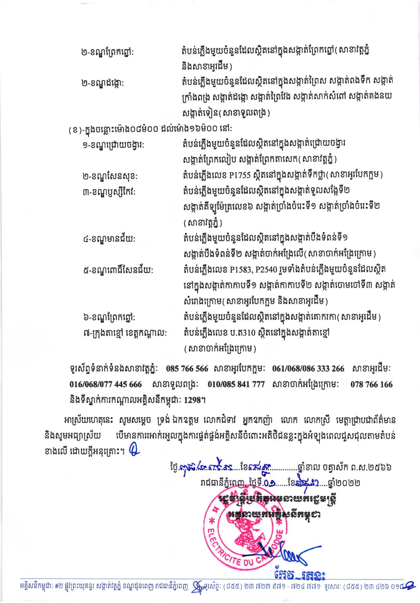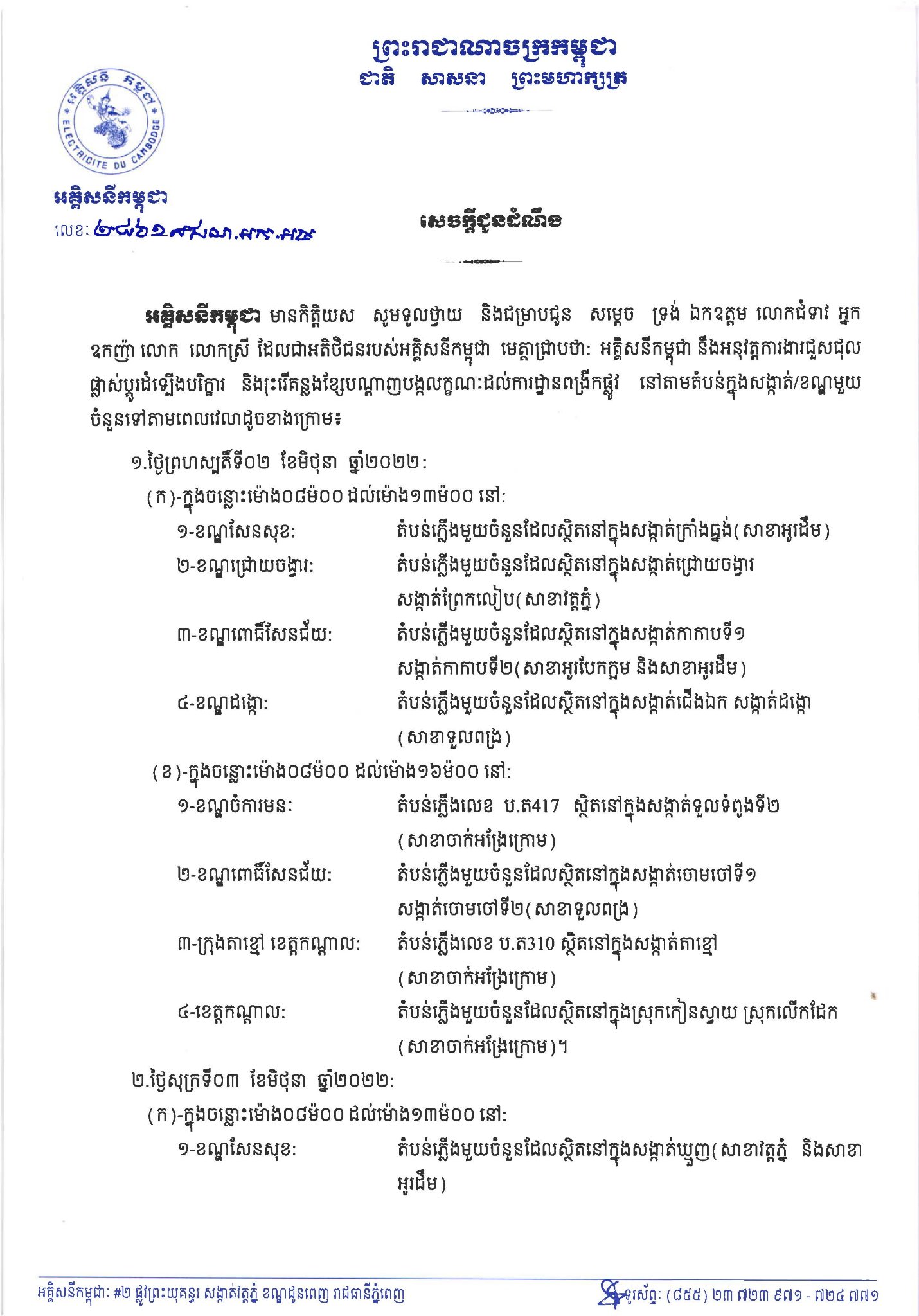 រាជធានីភ្នំពេញ៖ យោងតាមការចុះផ្សាយរបស់ អគ្គិសនីកម្ពុជា បានឲ្យដឹងថា នៅថ្ងៃពុធ ០២កើត ខែជេស្ឋ ឆ្នាំខាល ចត្វាស័ក ព.ស២៥៦៦ ត្រូវនឹងថ្ងៃទី០១ ខែមិថុនា ឆ្នាំ២០២២ បានសេចក្តីជូនដំណឹងស្តីពីការអនុវត្តការងារជួសជុល ផ្លាស់ប្តូរ តម្លើងបរិក្ខារនានា និងរុះរើគន្លងខ្សែបណ្តាញអគ្គិសនីរបស់អគ្គិសនីកម្ពុជា ដើម្បីបង្កលក្ខណៈងាយស្រួលដល់ការដ្ឋានពង្រីកផ្លូវ នៅថ្ងៃទី០២ ខែមិថុនា ឆ្នាំ២០២២ និងថ្ងៃទី០៣ ខែមិថុនា ឆ្នាំ២០២២ នៅតំបន់មួយចំនួនទៅតាមពេលវេលា និងទីកន្លែងដូចសេចក្តីជូនដំណឹងលម្អិតខាងក្រោម។