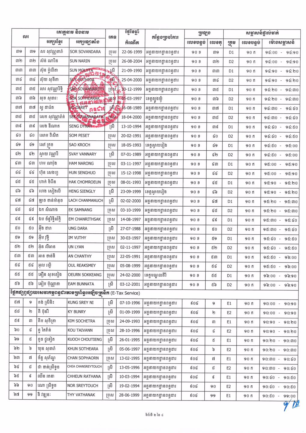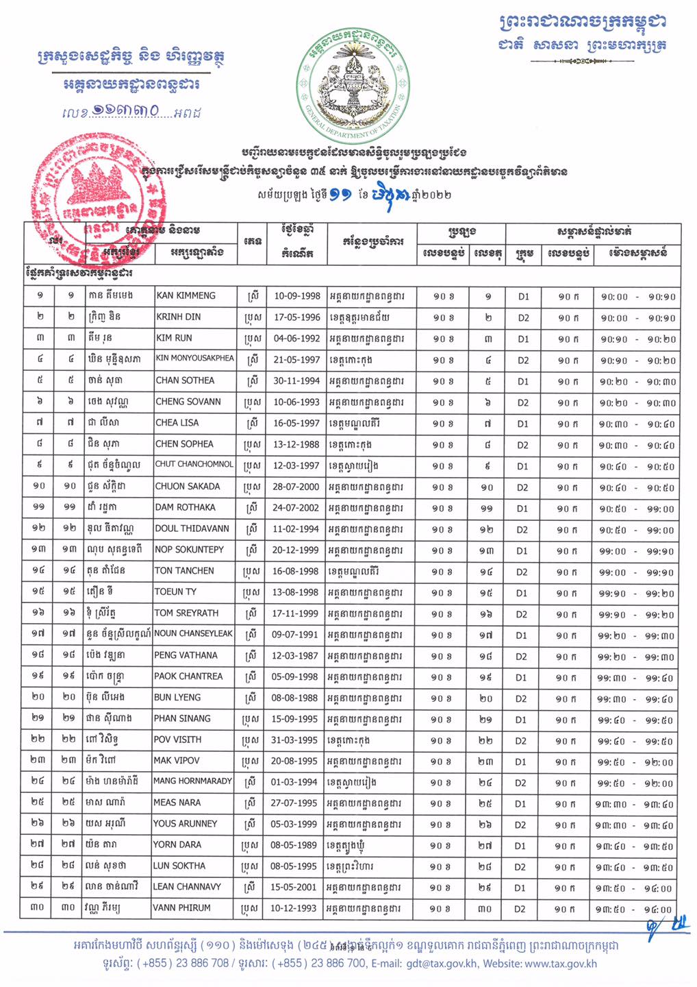 អគ្គនាយកដ្ឋានពន្ធដារ មានកិត្តិយសសូមជូនដំណឹងដល់បេក្ខជនទាំងអស់ ដែលមានរាយនាមក្នុងបញ្ជីរាយនាម បេក្ខជនមានសិទ្ធចូលរួមប្រឡងប្រជែងជ្រើសរើសមន្ត្រីជាប់កិច្ចសន្យាចំនួន ៣៥នាក់ ឲ្យចូលបម្រើការងារនៅនាយកដ្ឋានបច្ចេកវិទ្យាព័ត៌មាន នៃអគ្គនាយកដ្ឋានពន្ធដារ នៃក្រសួងសេដ្ឋកិច្ចនិងហិរញ្ញវត្ថុ ឲ្យបានជ្រាបថា អគ្គនាយកដ្ឋានពន្ធដារនឹងរៀបចំការប្រឡងប្រជែង និងធ្វើសម្ភាសន៍ផ្ទាល់មាត់តាមកាលបរិច្ឆេទ ពេលវេលា និងទីកន្លែងកំណត់ដូចខាងក្រោម៖
