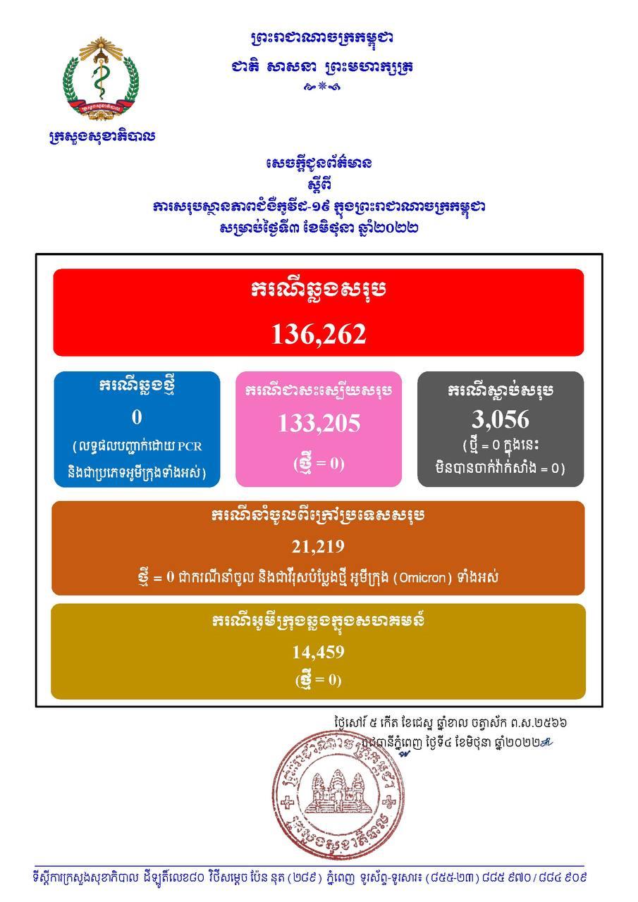 នៅថ្ងៃទី04 ខែមិថុនា ឆ្នាំ2022នេះ ក្រសួងសុខាភិបាលកម្ពុជា បានចេញសេចក្តីជូនដំណឹងពី ករណីកូវីដ-១៩ ដោយថ្ងៃនេះពុំមានរកឃើញករណីវិជ្ជមានវីរុសកូវីដ១៩ថ្មីទេ ខណៈអ្នកបានជាសះស្បើយថ្មីពុំមានដែរ និងមិនមានអ្នកបាត់បង់ជីវិតទេ ហើយគិតមកទល់ពេលនេះ ករណីឆ្លងកូវីដ១៩ សរុបនៅក្នុងប្រទេសកម្ពុជា មានចំនួន 136,262 នាក់, ករណីជាសះស្បើយសរុប 133,205 នាក់ និងស្លាប់សរុប 3,056 នាក់៕