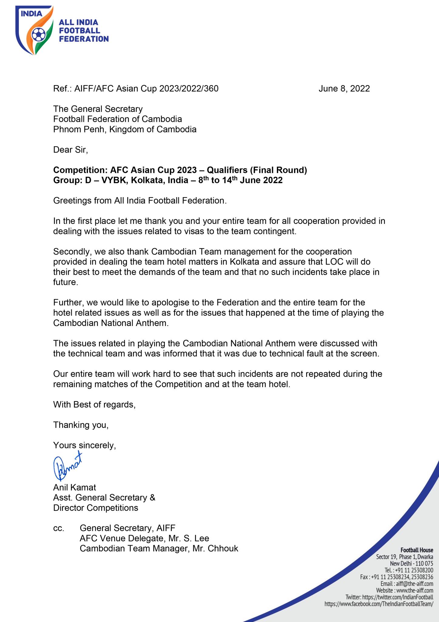 រាជធានីភ្នំពេញ៖ យោងតាមការចុះផ្សាយរបស់ សហព័ន្ធកីឡាបាល់ទាត់កម្ពុជា នៅថ្ងៃទី០៩ ខែមិថុនា ឆ្នាំ២០២២ បានឲ្យដឹងថា សហព័ន្ធបាល់ទាត់ឥណ្ឌា (AIFF) បានចេញលិខិតមួយ ដោយធ្វើការសុំអភ័យទោសដល់សហព័ន្ធបាល់ទាត់កម្ពុជា និងក្រុមបាល់ទាត់កម្ពុជា ចំពោះបញ្ហាចាក់ភ្លេងជាតិកម្ពុជា និងបញ្ហារៀបចំការស្នាក់នៅសម្រាប់កីឡាករខ្មែរ ដែលឥណ្ឌាធ្វើជាម្ចាស់ផ្ទះ នៃការប្រកួត AFC Asian Cup 2022 នាពេលនេះ។