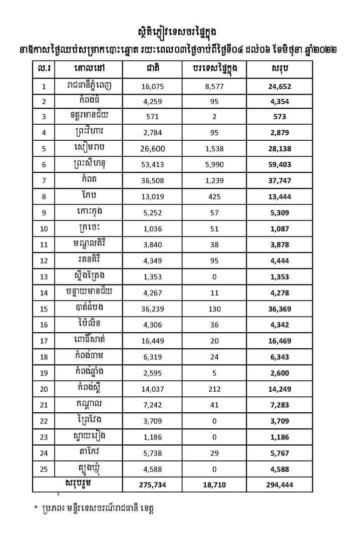រាជធានីភ្នំពេញ៦ច៖ ក្រសួងទេសចរណ៍ បានលើកឡើងអំពីស្ថានភាពភ្ញៀវទេសចរផ្ទៃក្នុងនាចុងសប្តាហ៍ និងថ្ងៃឈប់សម្រាកបោះឆ្នោត ចាប់ពីថ្ងៃទី០៤-០៦ ខែមិថុនា ឆ្នាំ២០២២ មានភ្ញៀវសរុបចំនួន ២៩៤ ៤៤៤នាក់ ក្នុងនោះ ភ្ញៀវជាតិ ២៧៥ ៧៣៤នាក់ និងភ្ញៀវបរទេសផ្ទៃក្នុង ១៨ ៧១០នាក់។