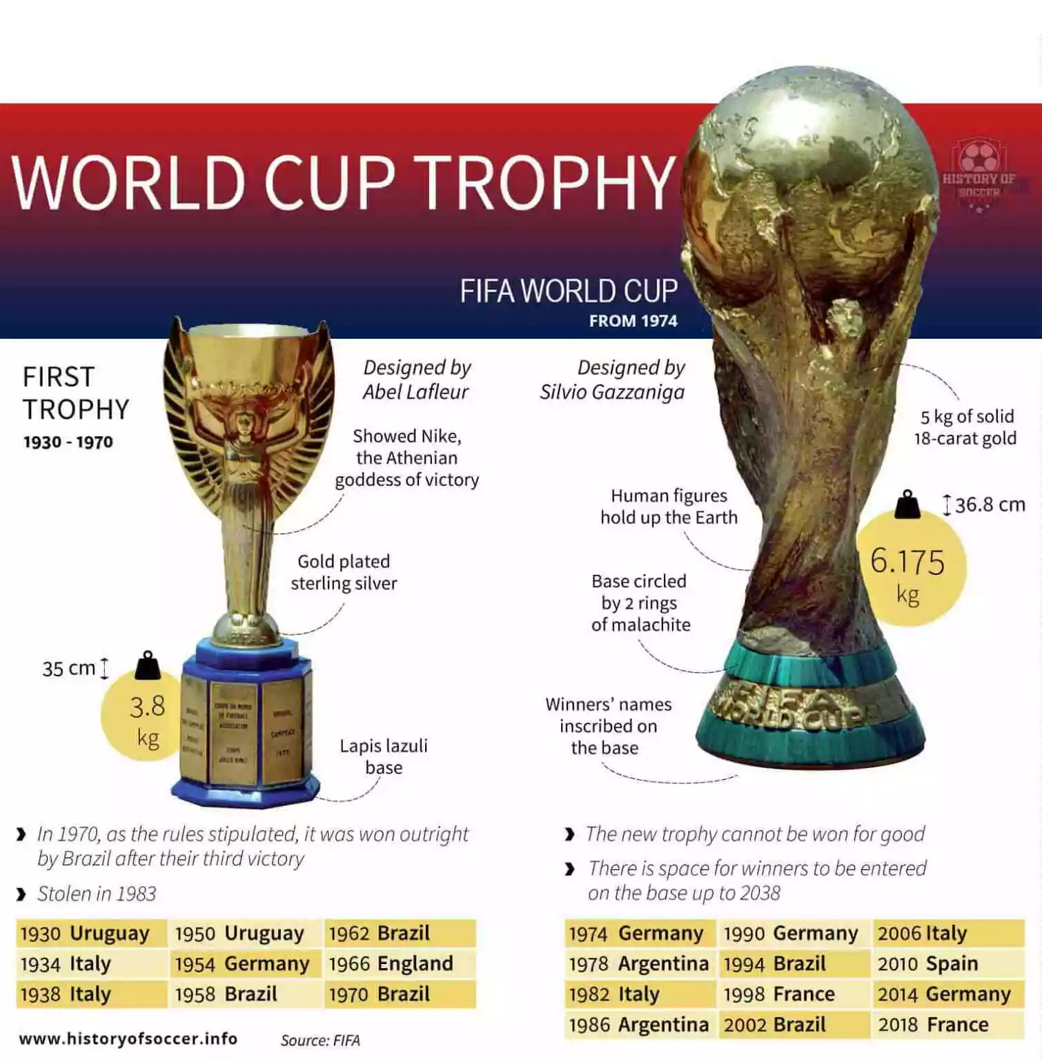 ខណៈពេលដែលកម្ពុជាកំពុងស្វាគមន៍ដំណើរទេសចរណ៍ពានរង្វាន់ FIFA World Cup ថ្ងៃនេះខ្មែរណូត នឹងរៀបរាប់ត្រួសៗអំពីប្រវត្តិខ្លះៗរបស់ពានរង្វាន់ដ៏អស្ចារ្យមួយនេះ។ World Cup គឺជាពានរង្វាន់មាស ដែលត្រូវប្រគល់ជូនប្រទេសណាមួយដែលឈ្នះការប្រកួតបាល់ទាត់សមាគម FIFA World Cup ។ ចាប់តាំងពីការមកដល់នៃការប្រកួតបាល់ទាត់ពិភពលោកនៅឆ្នាំ១៩៣០ ពានរង្វាន់ចំនួន ២ ត្រូវបានប្រើប្រាស់ គឺពានរង្វាន់ Jules Rimet ពីឆ្នាំ១៩៣០ ដល់ឆ្នាំ១៩៧០ និងពានរង្វាន់ FIFA World Cup ពីឆ្នាំ១៩៧៤ ដែលត្រូវបានប្រើប្រាស់រហូតដល់បច្ចុប្បន្ន។ វាគឺជាពានមួយ ក្នុងចំណោមពានរង្វាន់ដែលមានតម្លៃថ្លៃបំផុតក្នុងប្រវត្តិសាស្ត្រកីឡា ដោយសារវាមានតម្លៃរហូតដល់ទៅ ២០ លានដុល្លារឯណោះ។