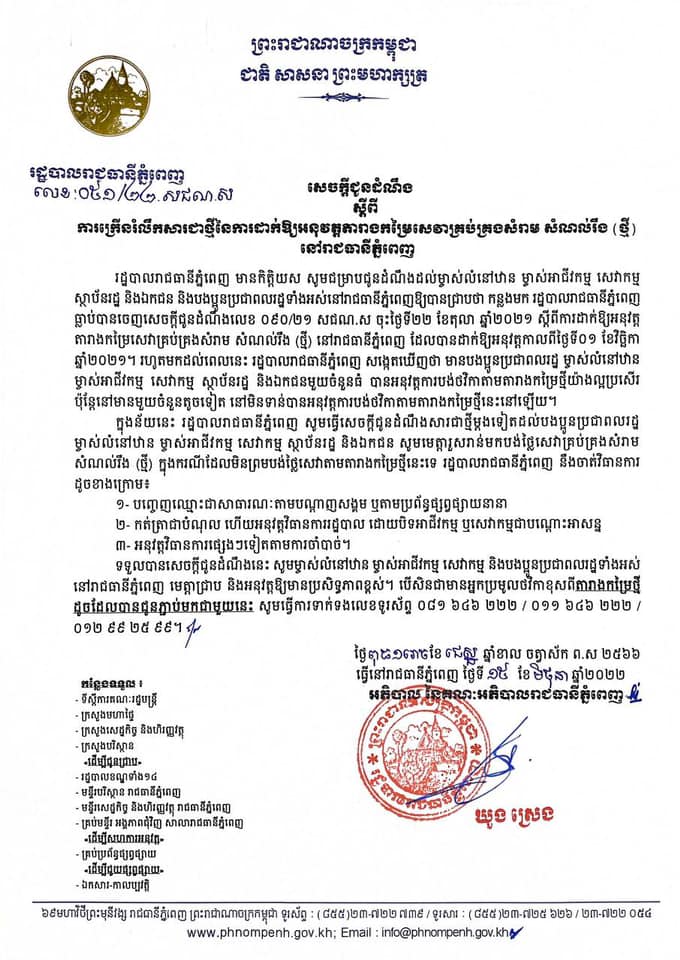 ទទួលបានសេចក្តីជូនដំណឹងនេះ សូមម្ចាស់លំនៅឋាន ម្ចាស់អាជីវកម្ម សេវាកម្ម និងបងប្អូនប្រជាពលរដ្ឋទាំងអស់នៅរាជធានីភ្នំពេញ មេត្តាជ្រាប និងអនុវត្តឲ្យមានប្រសិទ្ធភាពខ្ពស់។ បើសិនជាមានអ្នកប្រមូលថវិកាខុសពីតារាងកម្រៃថ្មីដូចដែលបានជូនភ្ជាប់មកជាមួយនេះ សូមធ្វើការទាក់ទងលេខទូរស័ព្ទ ០៨១ ៦៤៦ ២២២ / ០១១ ៦៤៦ ២២២ / ០១២ ៩៩ ២៥ ៩៩។