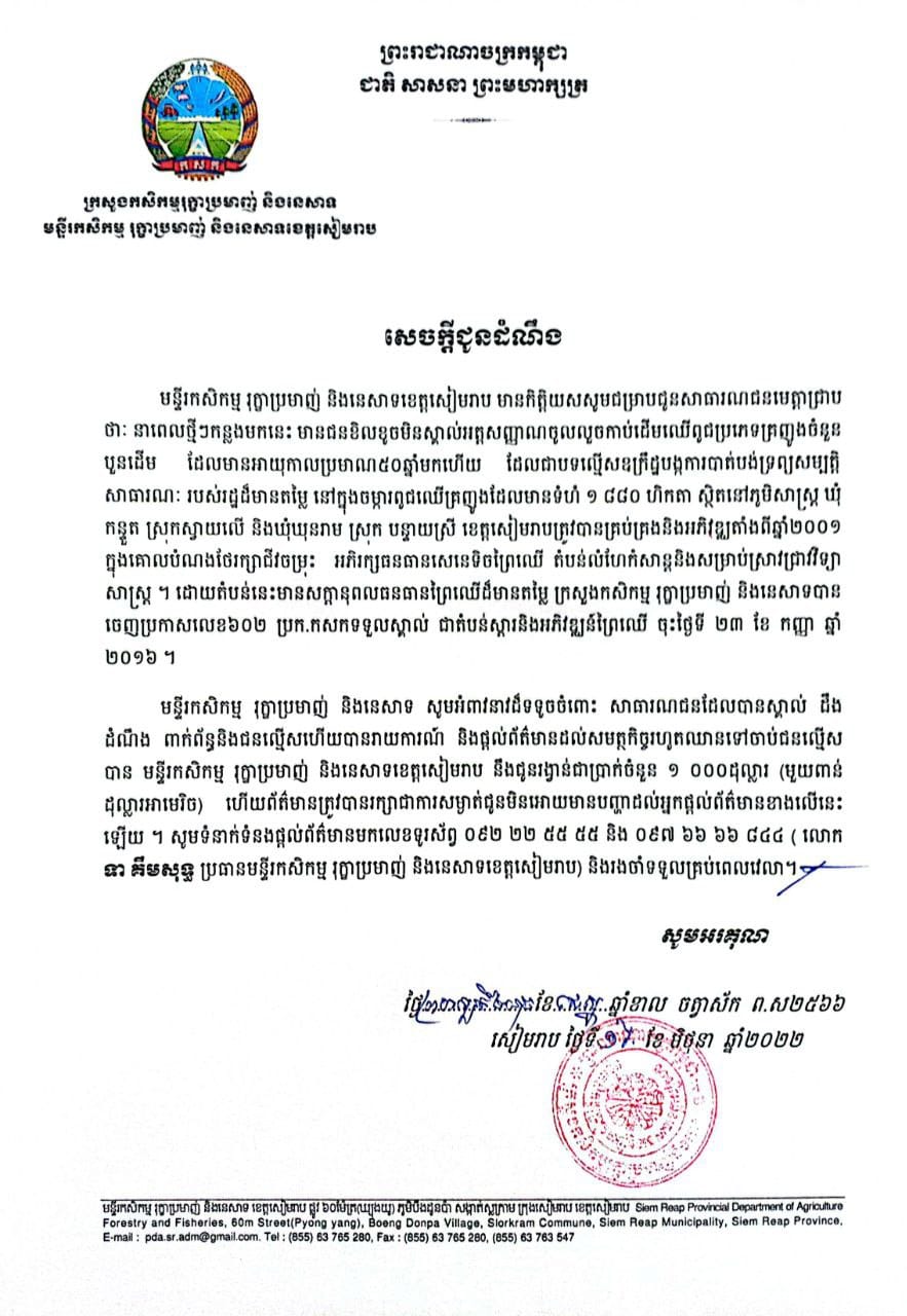 មន្ទីរកសិកម្ម រុក្ខាប្រមាញ់ និងនេសាទ សូមអំពាវនាវដ៏ទទូចចំពោះ សាធារណជនដែលបានស្គាល់ ដឹងដំណឹង ពាក់ព័ន្ធនឹងជនល្មើសហើយបានរាយការណ៍ និងផ្តល់ព័ត៌មានដល់សមត្ថកិច្ចរហូតឈានទៅចាប់ជនល្មើសបាន មន្ទីរកសិកម្ម រុក្ខាប្រមាញ់ និងនេសាទខេត្តសៀមរាប នឹងជូនរង្វាន់ជាប្រាក់ចំនួន ១ ០០០ដុល្លារ ហើយព័ត៌មានត្រូវបានរក្សាជាការសម្ងាត់ជូនមិនអោយមានបញ្ហាដល់អ្នកផ្តល់ព័ត៌មានខាងលើនេះឡើយ។ សូមទំនាក់ទំនងផ្តល់ព័ត៌មានមកលេខទូរស័ព្ទ ០៩២ ២២ ៥៥ ៥៥ និង ០៩៧ ៦៦ ៦៦ ៨៤៤៕