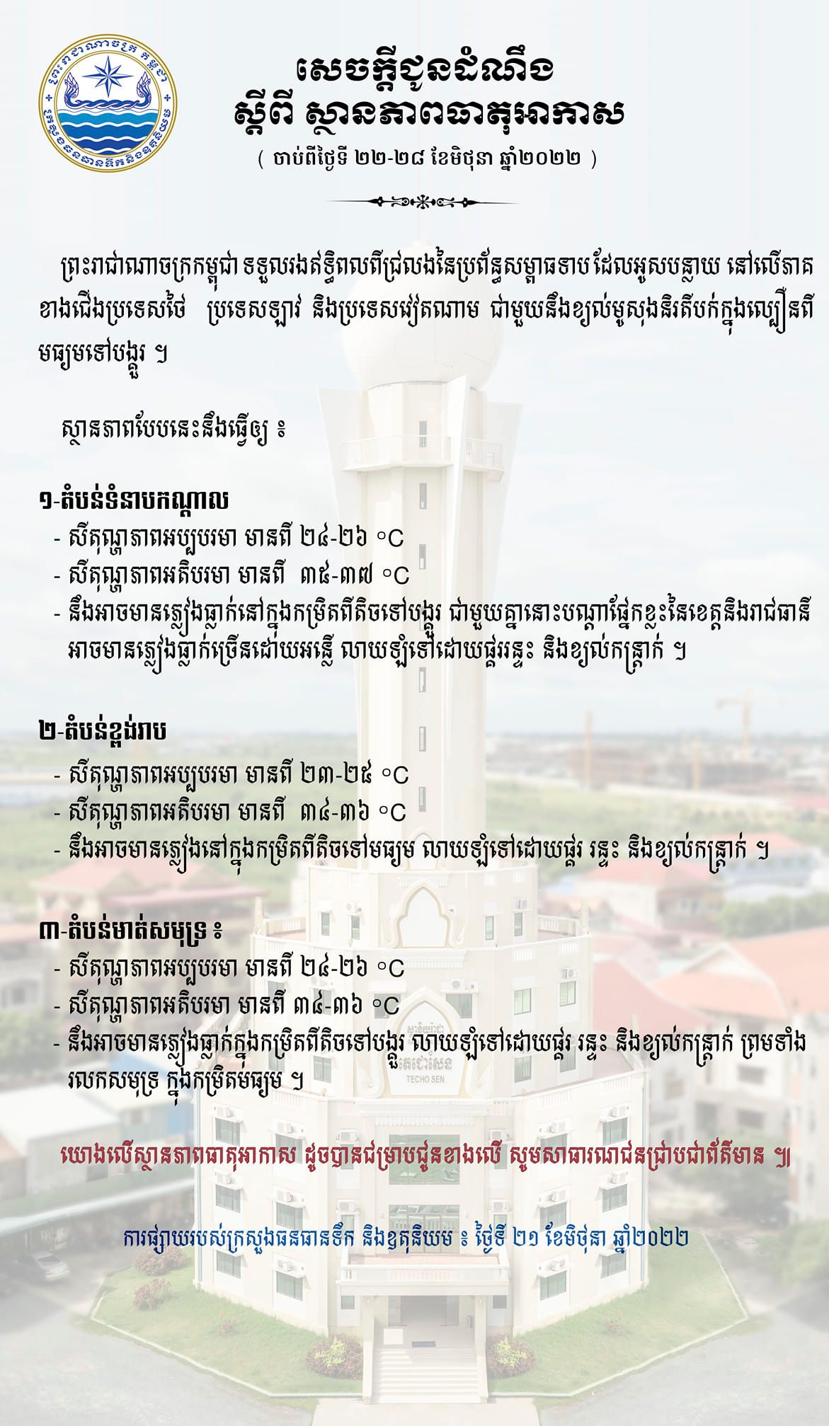 រាជធានីភ្នំពេញ៖ យោងតាមការចុះផ្សាយរបស់ ក្រសួងធនធានទឹក និងឧតុនិយម នៅថ្ងៃទី២១ ខែមិថុនា ឆ្នាំ២០២២ បានចេញសេចក្ដីជូនដំណឹង ស្ដីពីស្ថានភាពធាតុអាកាស ចាប់ពីថ្ងៃទី២២ ដល់ថ្ងៃទី២៨ ខែមិថុនា ឆ្នាំ២០២២ ឲ្យបានជ្រាបថា៖