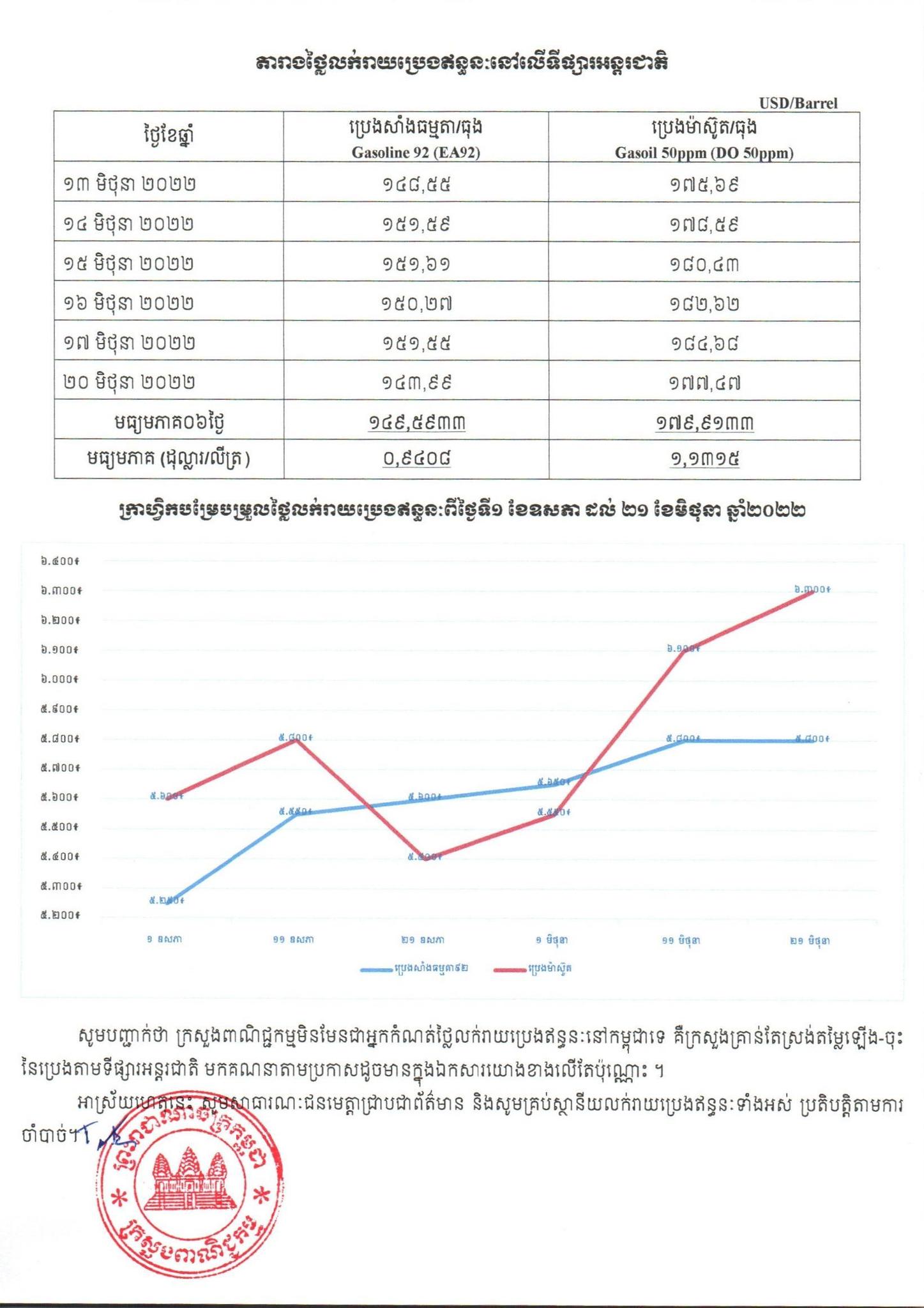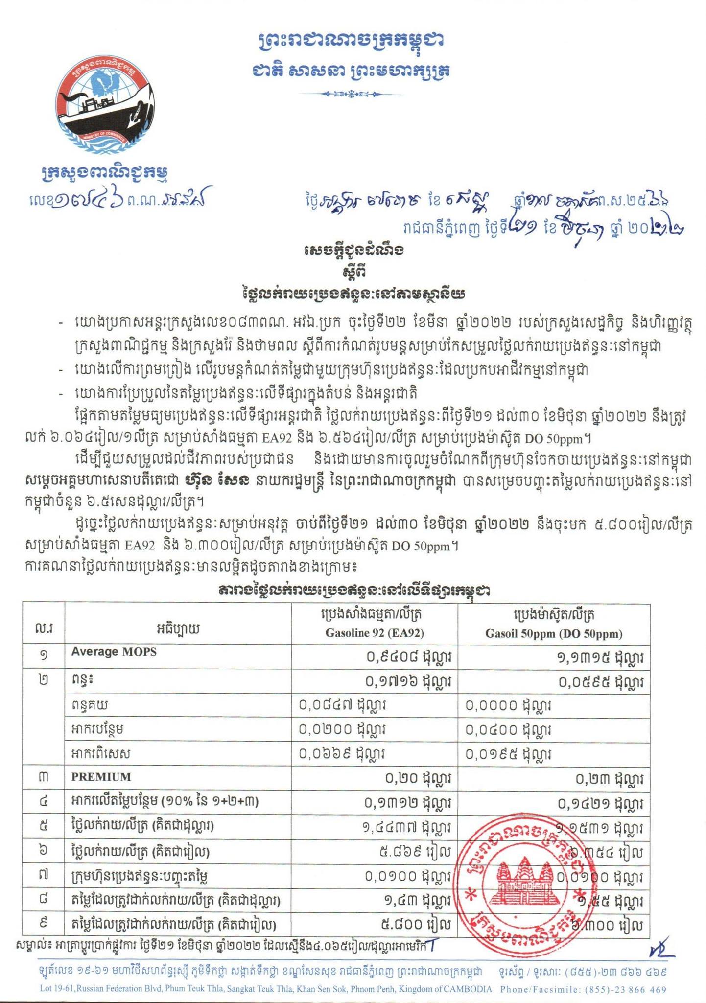 រាជធានីភ្នំពេញ៖ យោងតាមលិខិតរបស់ក្រសួងពាណិជ្ជកម្ម ចុះផ្សាយថ្ងៃទី២១ ខែមិថុនា ឆ្នាំ២០២២ ស្តីអំពីតម្លៃលក់រាយប្រេងឥន្ធនៈនៅតាមស្ថានីយទាំងអស់ក្នុងព្រះរាជាណាចក្រកម្ពុជាសម្រាប់អនុវត្តទៅតាមតម្លៃមធ្យមប្រេងឥន្ធនៈលើទីផ្សារអន្តរជាតិ ចាប់ពីថ្ងៃទី២១ ដល់ថ្ងៃទី៣០ ខែមិថុនា ឆ្នាំ២០២២ បានឲ្យដឹងថា តម្លៃប្រេងសាំងធម្មតាមានតម្លៃ ៥,៨០០រៀលក្នុងមួយលីត្រ ចំណែកឯប្រេងសាំងម៉ាស៊ូតមានតម្លៃ ៦,៣០០រៀលក្នុងមួយលីត្រប៉ុណ្ណោះ។