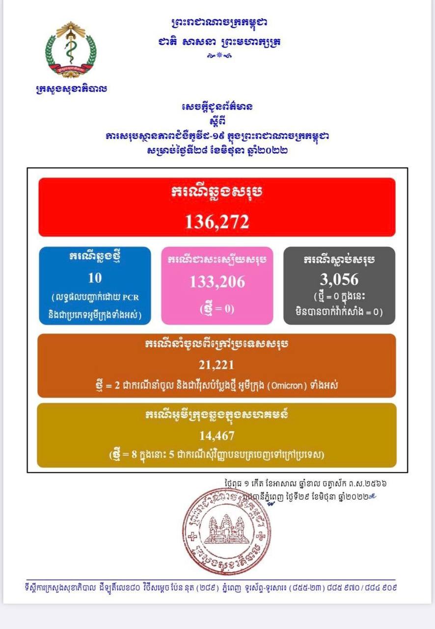 នៅថ្ងៃទី29 ខែមិថុនា ឆ្នាំ2022នេះ ក្រសួងសុខាភិបាលកម្ពុជា បានចេញសេចក្តីជូនដំណឹងពី ការរកឃើញករណីវិជ្ជមានវីរុសកូវីដ១៩ថ្មី ចំនួន ១០នាក់ (លទ្ធផលបញ្ជាក់ដោយ PCR នឹងជាប្រភេទអូមីក្រុងទាំងអស់) ក្នុងនោះករណីឆ្លងសហគមន៍ ០៨នាក់( ៥ករណីសុំវិញ្ញាបនបត្រចេញទៅក្រៅប្រទេស) និងករណីនាំចូលចំនួន ០២នាក់ ខណៈអ្នកបានជាសះស្បើយថ្មីពុំមានទេ និងមិនមានអ្នកបាត់បង់ជីវិតទេ ហើយគិតមកទល់ពេលនេះ ករណីឆ្លងកូវីដ១៩ សរុបនៅក្នុងប្រទេសកម្ពុជា មានចំនួន 136,272 នាក់, ករណីជាសះស្បើយសរុប 133,206 នាក់ និងស្លាប់សរុប 3,056 នាក់៕