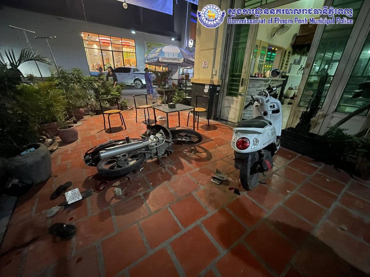 សម្ភារៈខូចខាត៖ ម៉ូតូម៉ាកហុងដាសេ១២៥ ពណ៌ខ្មៅ សេរីឆ្នាំ២០២២ ពាក់ផ្លាកលេខ ភ្នំពេញ ១JF៦៤៧៨ រងការខូចចាតដាច់កន្ទុយម៉ូតូ និងផ្លាកលេខដាច់ចេញពីម៉ូតូ បែកកុងទ័រម៉ូតូ និងបែកសង្កៀងស្កុបម៉ូតូខាងក្រោយ, ម៉ូតូម៉ាកហុងដាស្កុបពី ពណ៌ ស ពាក់ផ្លាកលេខ ភ្នំពេញ ១IR១៨០០ រងការខូចខាតដាច់កន្ទុយម៉ូតូ និងផ្លាកលេខចេញពីម៉ូតូ និងបែកកុងទ័រ។