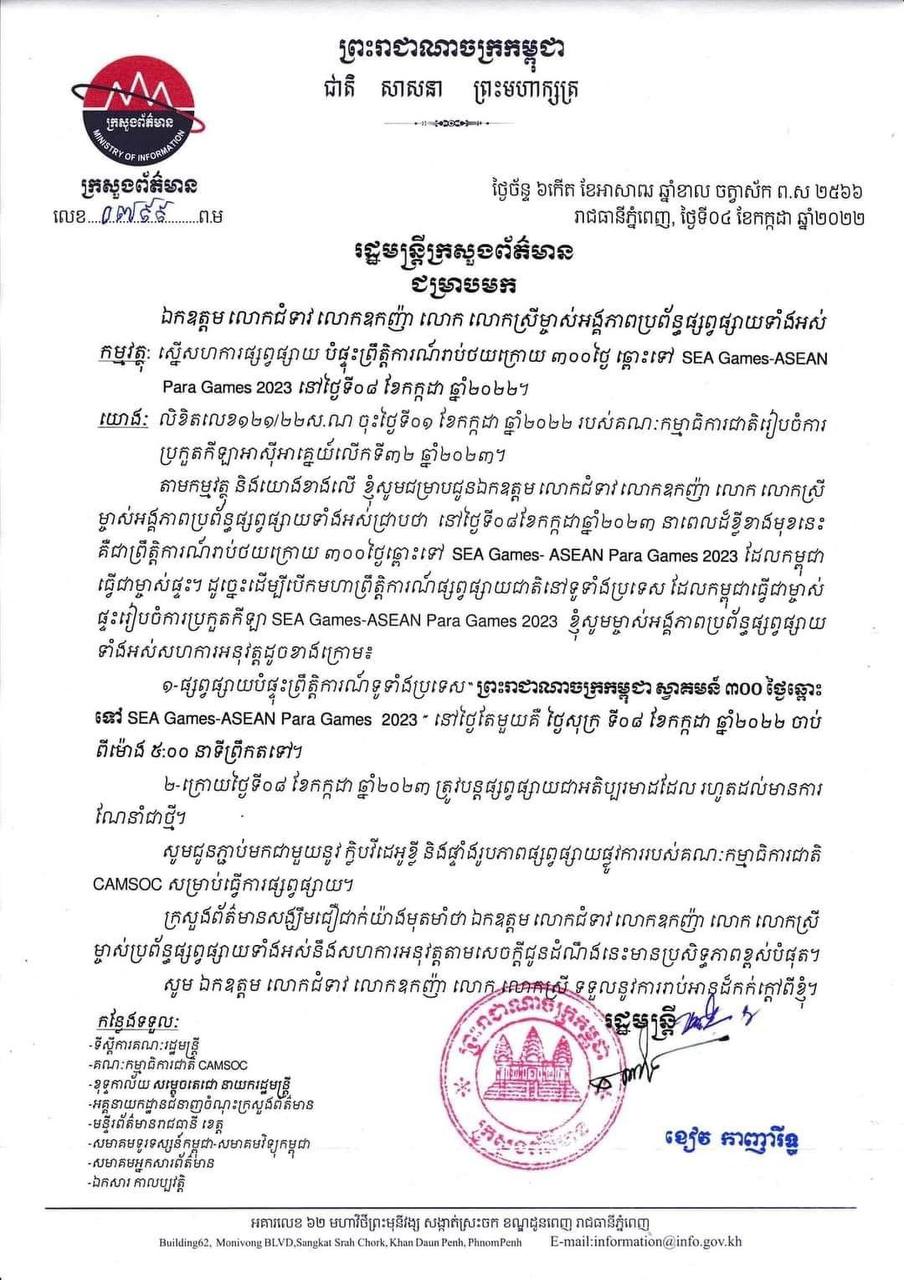 ក្រសួងព័ត៌មាន សូមជម្រាបជូនថា នៅថ្ងៃទី០៨ ខែកក្កដា ឆ្នាំ២០២៣នាពេលដ៏ខ្លីខាងមុខនេះ គឺជាព្រឹត្តិការណ៍រាប់ថយក្រោយ ៣០០ថ្ងៃឆ្ពោះទៅ SEA Games-ASEAN Para Games2023 ដែលកម្ពុជា ធ្វើជាម្ចាស់ផ្ទះ។ ដូច្នេះ ដើម្បីបើកមហាព្រឹត្តិការណ៍ផ្សព្វផ្សាយជាតិនៅទូទាំងប្រទេស ដែលកម្ពុជា ធ្វើជាម្ចាស់ផ្ទះរៀបចំការប្រកួតកីឡា SEA Games-ASEAN Para Games2023 ខ្ញុំសូមម្ចាស់អង្គភាពប្រព័ន្ធផ្សព្វផ្សាយទាំងអស់សហការអនុវត្តដូចខាងក្រោម៖