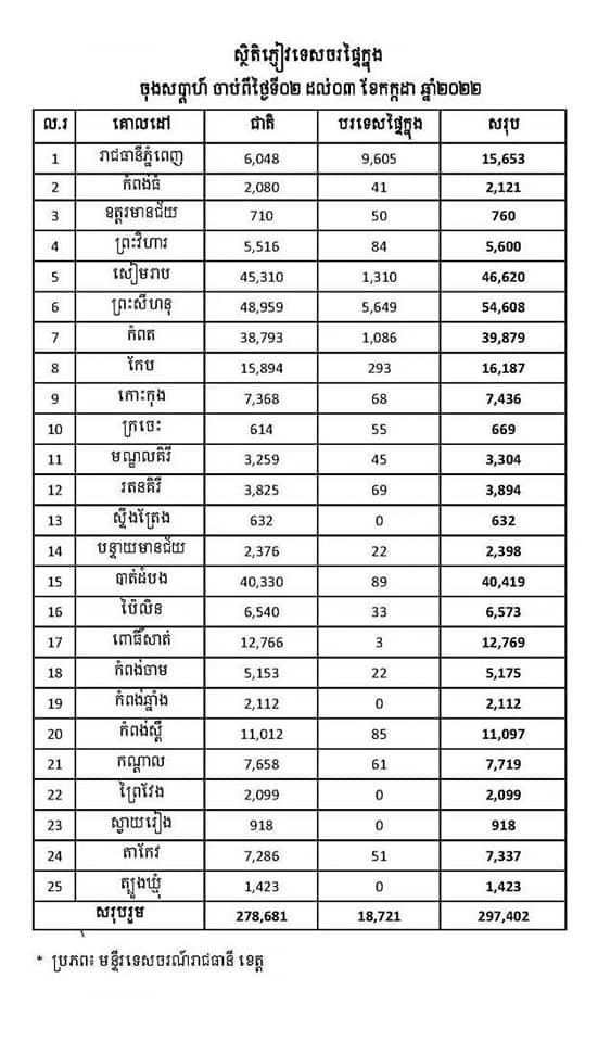 រាជធានីភ្នំពេញ៖ យោងតាមការចុះផ្សាយរបស់ ក្រសួងព័ត៌មាន នៅថ្ងៃទី០៥ ខែកក្កដា ឆ្នាំ២០២២ បានឲ្យដឹងថា ស្ថានភាពភ្ញៀវទេសចរផ្ទៃក្នុងប្រចាំសប្តាហ៍ថ្ងៃទី០២-០៣ ខែកក្កដា ឆ្នាំ២០២២ ភ្ញៀវសរុបមានចំនួន ២៩៧ ៤០២នាក់ ក្នុងនោះភ្ញៀវជាតិ ២៧៨ ៦៨១នាក់ ភ្ញៀវបរទេសផ្ទៃក្នុង ១៨ ៧២១នាក់។ នេះបើយោងតាមរបាយការណ៍របស់ក្រសួងទេសចរណ៍។