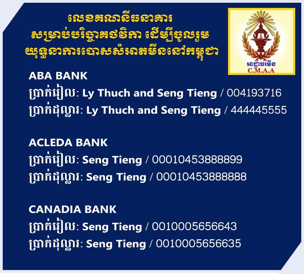 សម្តេចតេជោ បានបន្ថែមទៀតថា នេះជាចលនាជាតិដ៏ធំ ដើម្បីឆ្ពោះទៅរកសូន្យគ្រាប់មីននៅឆ្នាំ២០២៥។ ដើម្បីសម្រួលដល់ការចូលរួមរបស់បងប្អូនជាបន្តទៀតអាជ្ញាធរមីនកម្ពុជាបានបើកគណនីនៅធនាគារABA ធនាគារអេស៊ីលីដា និងធនាគារកាណាឌីយ៉ាដូចមានភ្ជាប់មកជាមួយ។ ខ្ញុំសង្ឃឹមថាជនរួមជាតិយើងទាំងក្នុងនិងក្រៅប្រទេសនឹងបន្តចូលរួមក្នុងយុទ្ធនាការឈានទៅបញ្ចប់សោកនាដកម្មលើទឹកដីដ៏កំសត់របស់យើងត្រឹមឆ្នាំ២០២៥៕