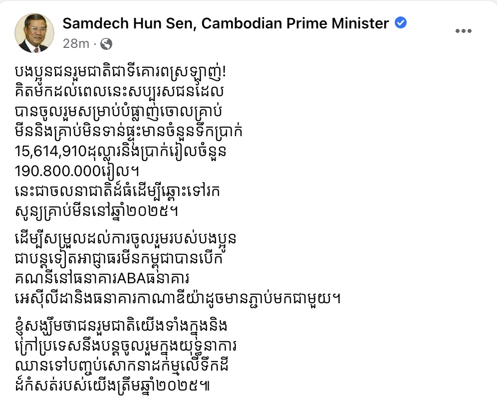សម្តេចតេជោ ហ៊ុន សែន បញ្ជាក់ថា គិតមកដល់ពេលនេះ សប្បុរសជនបានចូលរួមបរិច្ចាគថវិកាដោះស្រាយបញ្ហាគ្រាប់មីននៅកម្ពុជាសរុបបានជាង ១៥លានដុល្លារ និងប្រាក់រៀលជាង ១៩០លានរៀល